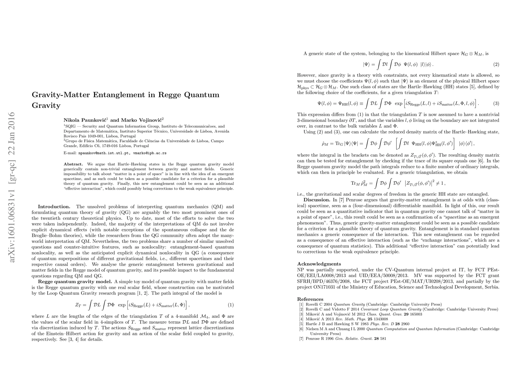 We argue that Hartle-Hawking states in the Regge quantum gravity model generically contain non-trivial entanglement between gravity and matter fields. Generic impossibility to talk about "matter in a point of space" is in line with the idea of an emergent spacetime, and as such could be taken as a possible candidate for a criterion for a plausible theory of quantum gravity. Finally, this new entanglement could be seen as an additional "effective interaction", which could possibly bring corrections to the weak equivalence principle.