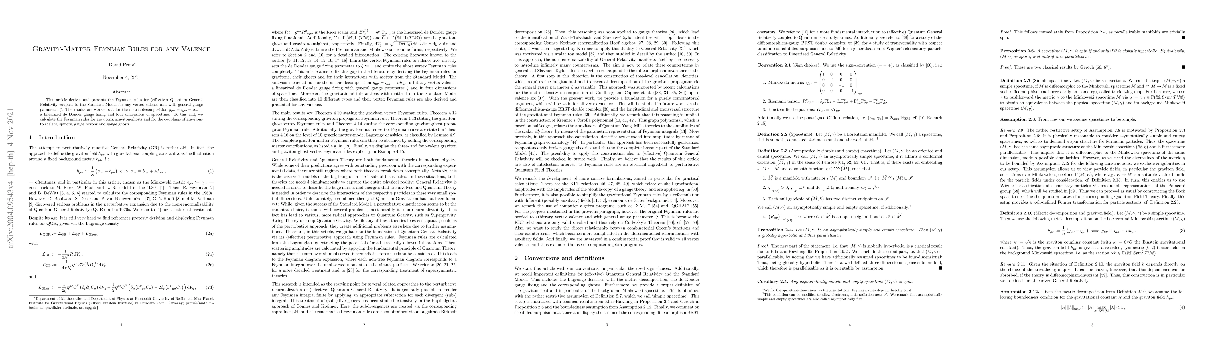 This article derives and presents the Feynman rules for (effective) Quantum General Relativity coupled to the Standard Model for any vertex valence and with general gauge parameter $\zeta$. The results are worked out for the metric decomposition $g_{\mu \nu} = \eta_{\mu \nu} + \varkappa h_{\mu \nu}$, a linearized de Donder gauge fixing and four dimensions of spacetime. To this end, we calculate the Feynman rules for gravitons, graviton-ghosts and for the couplings of gravitons to scalars, spinors, gauge bosons and gauge ghosts.