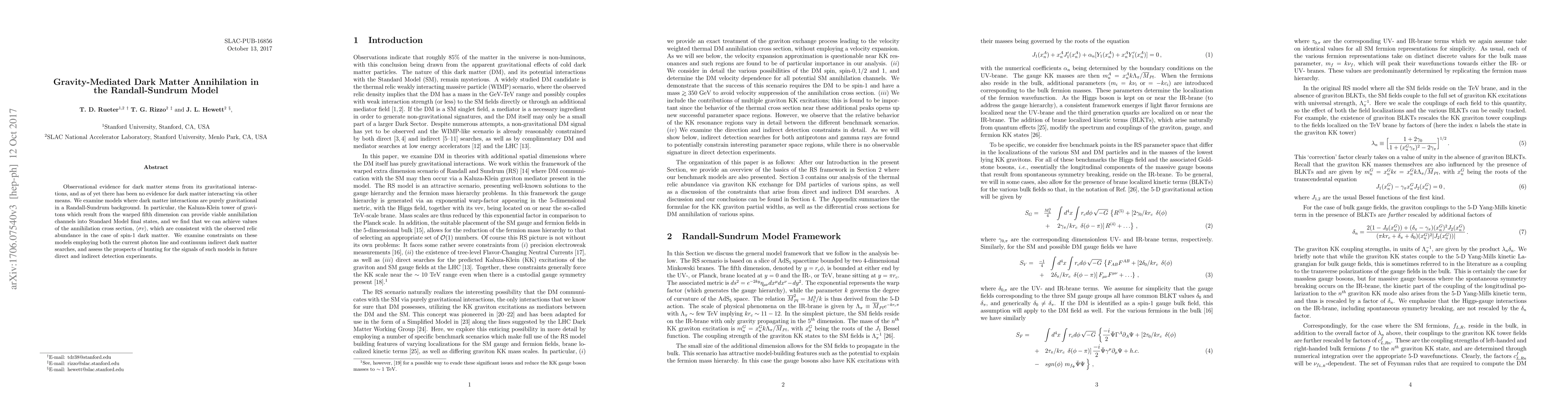 This paper explores gravity-mediated dark matter annihilation in the Randall-Sundrum model, focusing on the Kaluza-Klein gravitons as potential annihilation channels. It finds viable annihilation cross sections consistent with observed relic abundances for spin-1 dark matter and assesses constraints from current indirect searches, while also discussing future detection prospects.