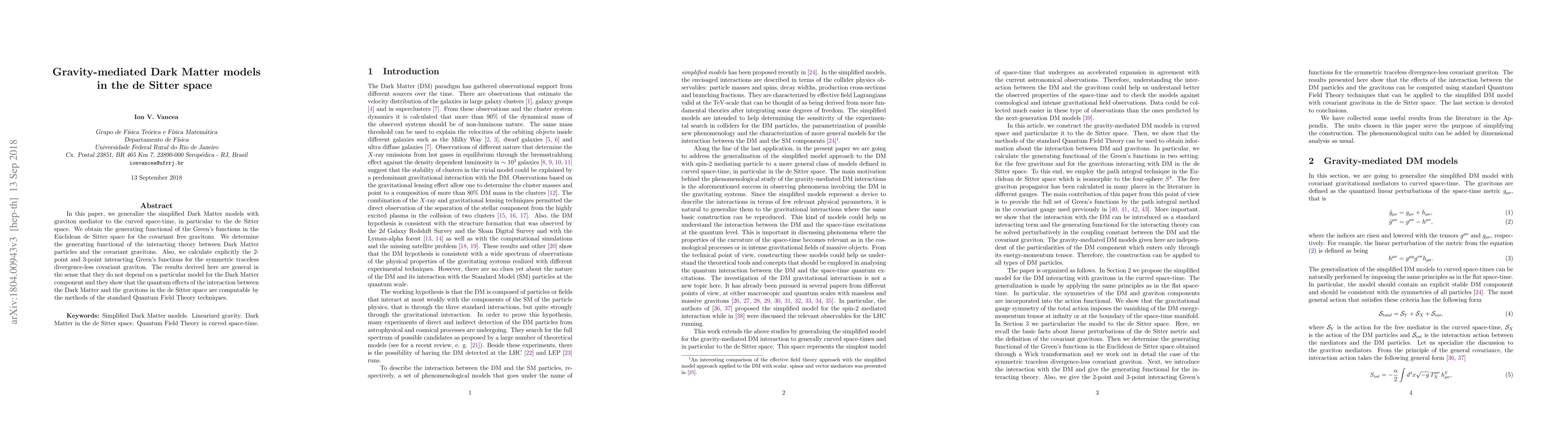 In this paper, we generalize the simplified Dark Matter models with graviton mediator to the curved space-time, in particular to the de Sitter space. We obtain the generating functional of the Green's functions in the Euclidean de Sitter space for the covariant free gravitons. We determine the generating functional of the interacting theory between Dark Matter particles and the covariant gravitons. Also, we calculate explicitly the 2-point and 3-point interacting Green's functions for the symmetric traceless divergence-less covariant graviton. The results derived here are general in the sense that they do not depend on a particular model for the Dark Matter component and they show that the quantum effects of the interaction between the Dark Matter and the gravitons in the de Sitter space are computable by the methods of the standard Quantum Field Theory techniques.
