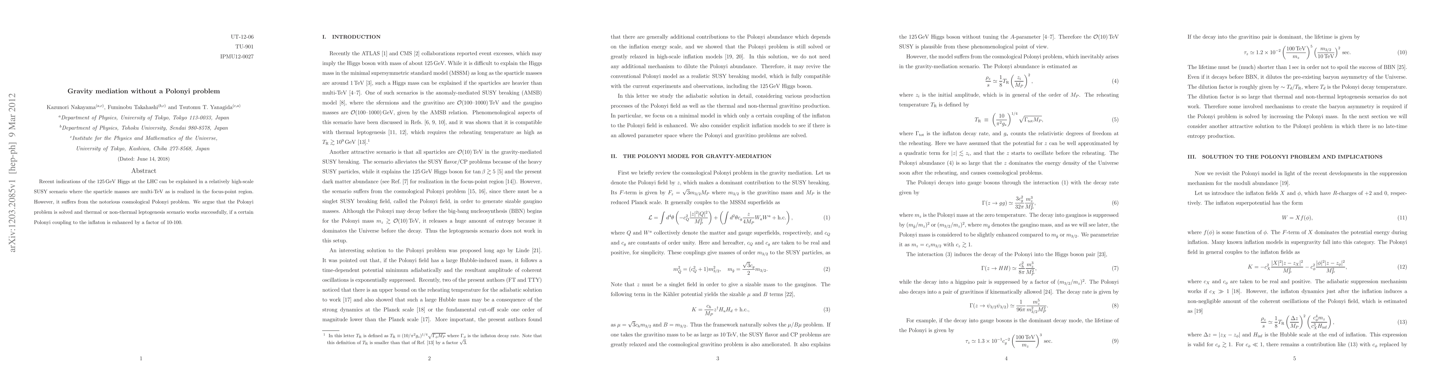 This paper proposes a solution to the Polonyi problem in gravity mediation scenarios, suggesting that enhancing the Polonyi coupling to the inflaton by a factor of 10-100 allows for successful thermal or non-thermal leptogenesis in high-scale SUSY models consistent with the 125GeV Higgs.