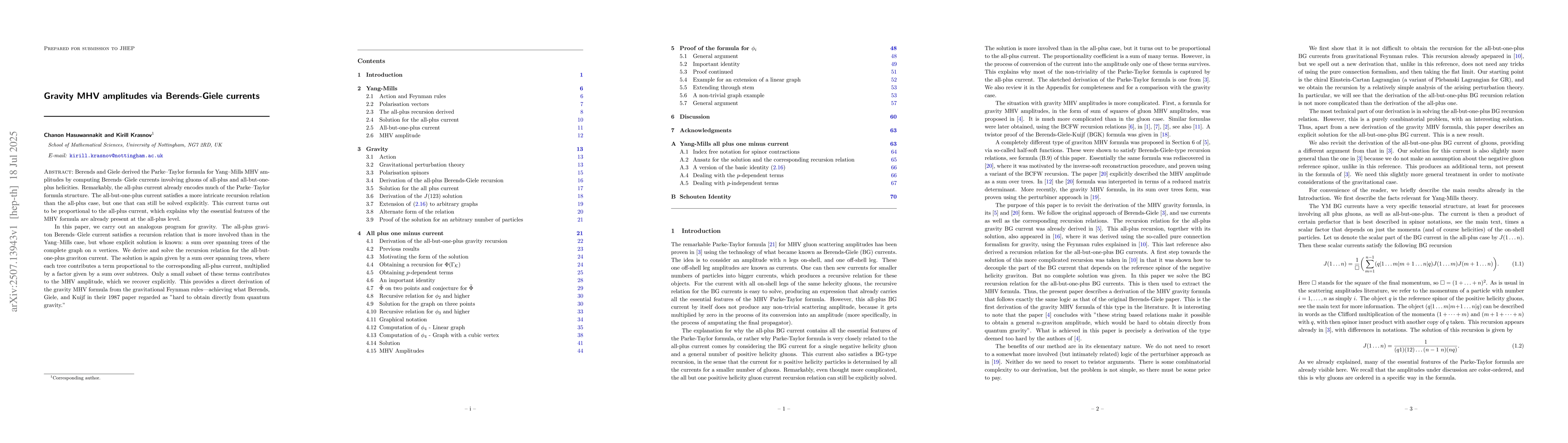 Berends and Giele derived the Parke-Taylor formula for Yang-Mills MHV amplitudes by computing Berends-Giele currents involving gluons of all-plus and all-but-one-plus helicities. Remarkably, the all-plus current already encodes much of the Parke-Taylor formula structure. The all-but-one-plus current satisfies a more intricate recursion relation than the all-plus case, but one that can still be solved explicitly. This current turns out to be proportional to the all-plus current, which explains why the essential features of the MHV formula are already present at the all-plus level. In this paper, we carry out an analogous program for gravity. The all-plus graviton Berends-Giele current satisfies a recursion relation that is more involved than in the Yang-Mills case, but whose explicit solution is known: a sum over spanning trees of the complete graph on n vertices. We derive and solve the recursion relation for the all-but-one-plus graviton current. The solution is again given by a sum over spanning trees, where each tree contributes a term proportional to the corresponding all-plus current, multiplied by a factor given by a sum over subtrees. Only a small subset of these terms contributes to the MHV amplitude, which we recover explicitly. This provides a direct derivation of the gravity MHV formula from the gravitational Feynman rules - achieving what Berends, Giele, and Kuijf in their 1987 paper regarded as "hard to obtain directly from quantum gravity".