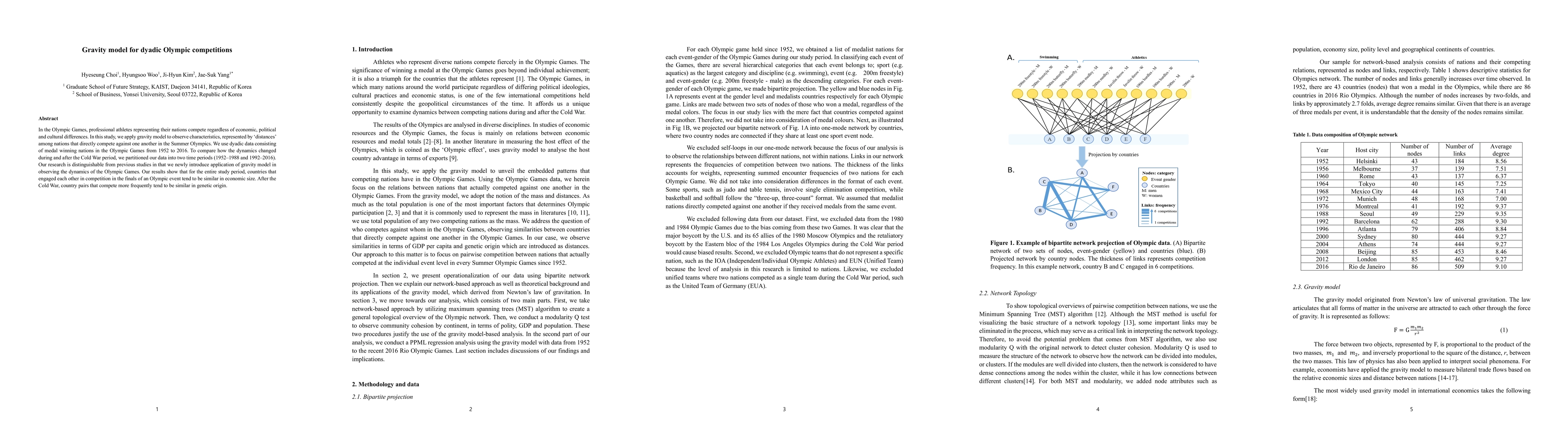 This study applies the gravity model to Olympic dyadic data (1952-2016) to examine competition patterns. Results show that during the entire period, competing nations tend to have similar economic sizes. Post-Cold War, nations competing frequently share genetic origins.