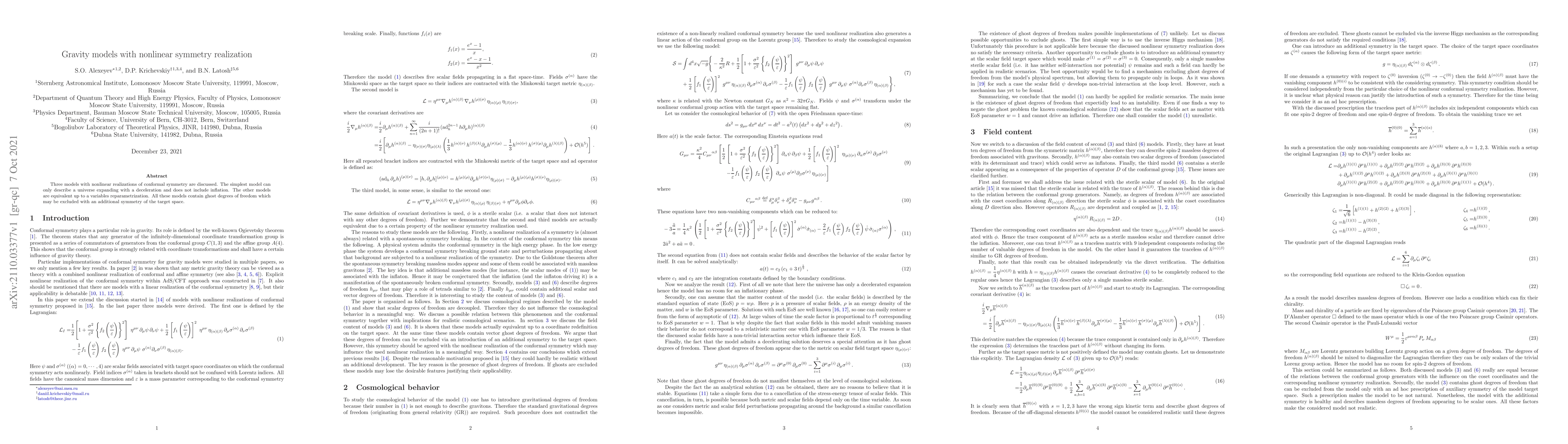 Three models with nonlinear realizations of conformal symmetry are discussed. The simplest model can only describe a universe expanding with a deceleration and does not include inflation. The other models are equivalent up to a variables reparametrization. All these models contain ghost degrees of freedom which may be excluded with an additional symmetry of the target space.