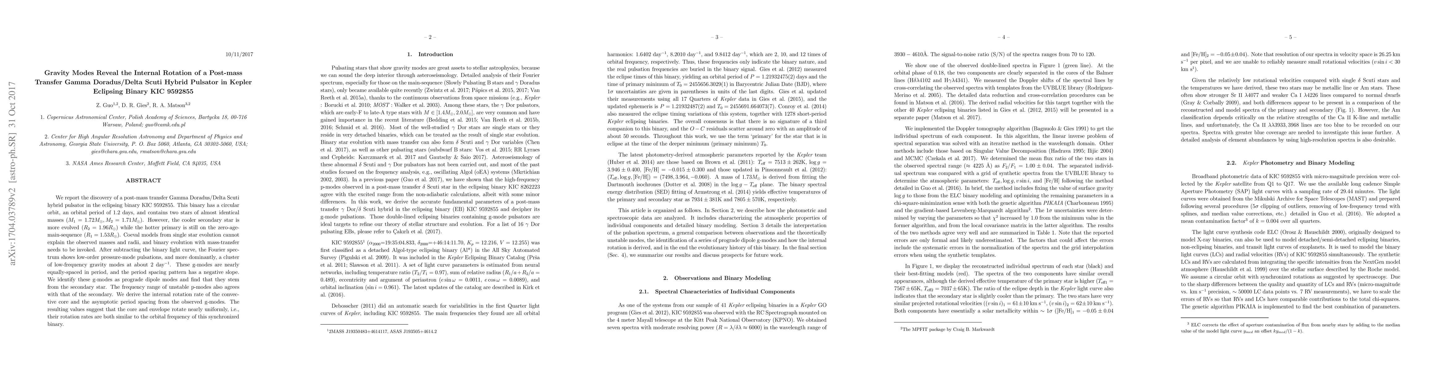 This paper reports on the discovery of hybrid pulsations in the secondary star of the eclipsing binary KIC 9592855, revealing its internal rotation through gravity modes. The secondary star exhibits synchronized rotation with its orbital frequency, indicating uniform rotation in both its core and envelope.