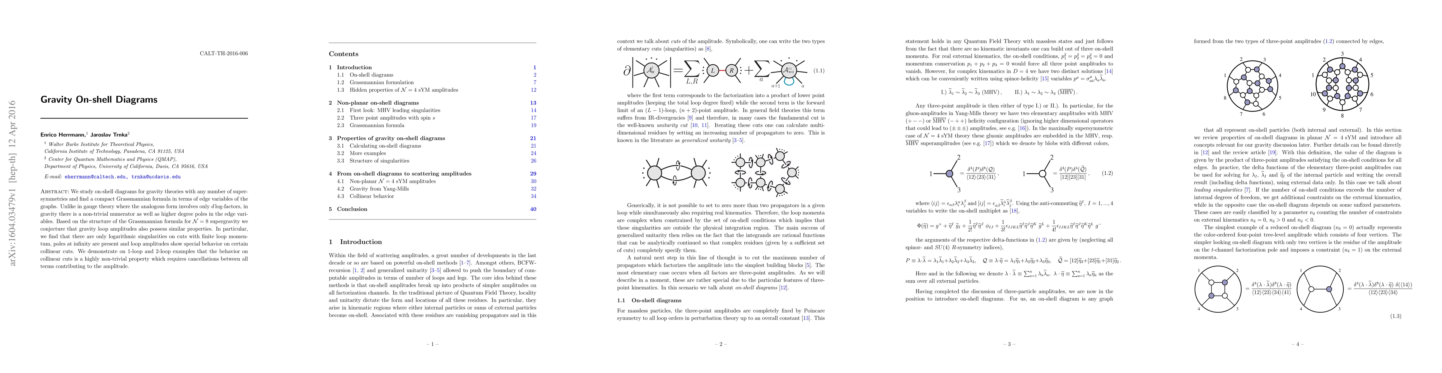This paper investigates on-shell diagrams in gravity theories with various levels of supersymmetry, deriving a compact Grassmannian formula involving edge variables. Unlike gauge theories, gravity diagrams exhibit non-trivial numerators and higher-degree poles, leading to a conjecture about similar properties in gravity loop amplitudes, including logarithmic singularities and special behavior on collinear cuts requiring intricate cancellations.