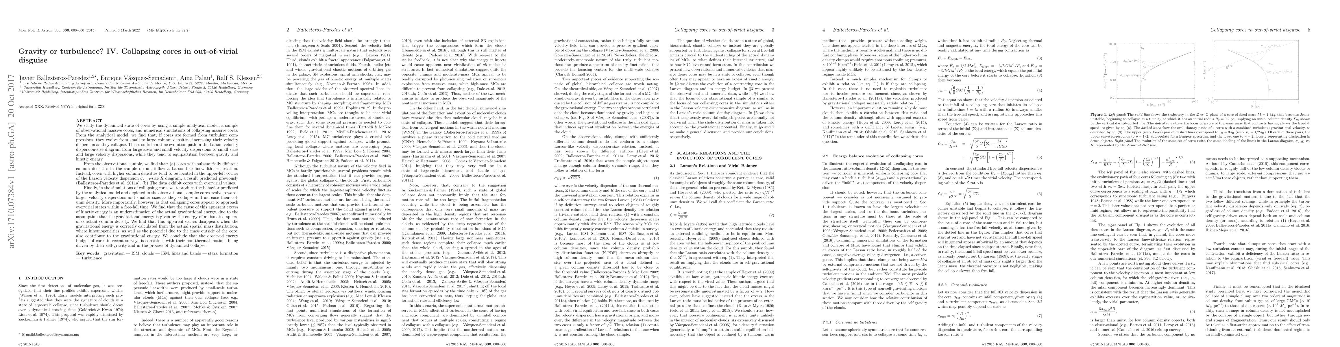 We study the dynamical state of cores by using a simple analytical model, a sample of observational massive cores, and numerical simulations of collapsing massive cores. From the model, we find that, if cores are formed from turbulent compressions, they evolve from small to large column densities, increasing their velocity dispersion as they collapse, while they tend to equipartition between gravity and kinetic energy. From the observational sample, we find that: (a) cores with substantially different column densities in the sample do not follow a Larson-like linewidth-size relation. Instead, cores with higher column densities tend to be located in the upper-left corner of the Larson velocity dispersion-size diagram, a result predicted previously (Ballesteros-Paredes et al. 2011a). (b) The data exhibit cores with overvirial values. Finally, in the simulations we reproduce the behavior depicted by the model and observational sample: cores evolve towards larger velocity dispersions and smaller sizes as they collapse and increase their column density. However, collapsing cores appear to approach overvirial states within a free-fall time. The cause of this apparent excess of kinetic energy is an underestimation of the gravitational energy, due to the assumption that the gravitational energy is given by the energy of an isolated sphere of constant column density. This excess disappears when the gravitational energy is correctly calculated from the actual spatial mass distribution, where inhomogeneities, as well as the potential due to the mass outside of the core, also contribute to the gravitational energy. We conclude that the observed energy budget of cores in surveys is consistent with their non-thermal motions being driven by their self-gravity and in a hierarchical and chaotic collapse.