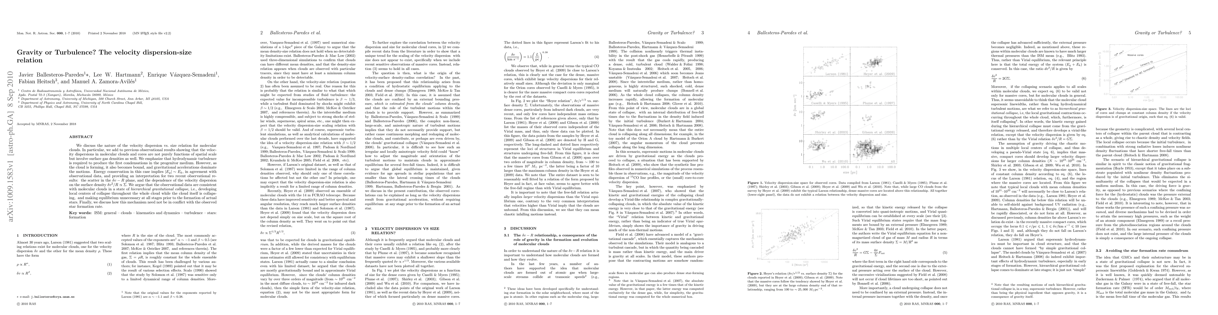 We discuss the nature of the velocity dispersion vs. size relation for molecular clouds. In particular, we add to previous observational results showing that the velocity dispersions in molecular clouds and cores are not purely functions of spatial scale but involve surface gas densities as well. We emphasize that hydrodynamic turbulence is required to produce the first condensations in the progenitor medium. However, as the cloud is forming, it also becomes bound, and gravitational accelerations dominate the motions. Energy conservation in this case implies $|E_g| \sim E_k$, in agreement with observational data, and providing an interpretation for two recent observational results: the scatter in the $\delta v-R$ plane, and the dependence of the velocity dispersion on the surface density ${\delta v^2/ R} \propto \Sigma$. We argue that the observational data are consistent with molecular clouds in a state of hierarchical gravitational collapse, i.e., developing local centers of collapse throughout the whole cloud while the cloud itself is collapsing, and making equilibrium unnecessary at all stages prior to the formation of actual stars. Finally, we discuss how this mechanism need not be in conflict with the observed star formation rate.