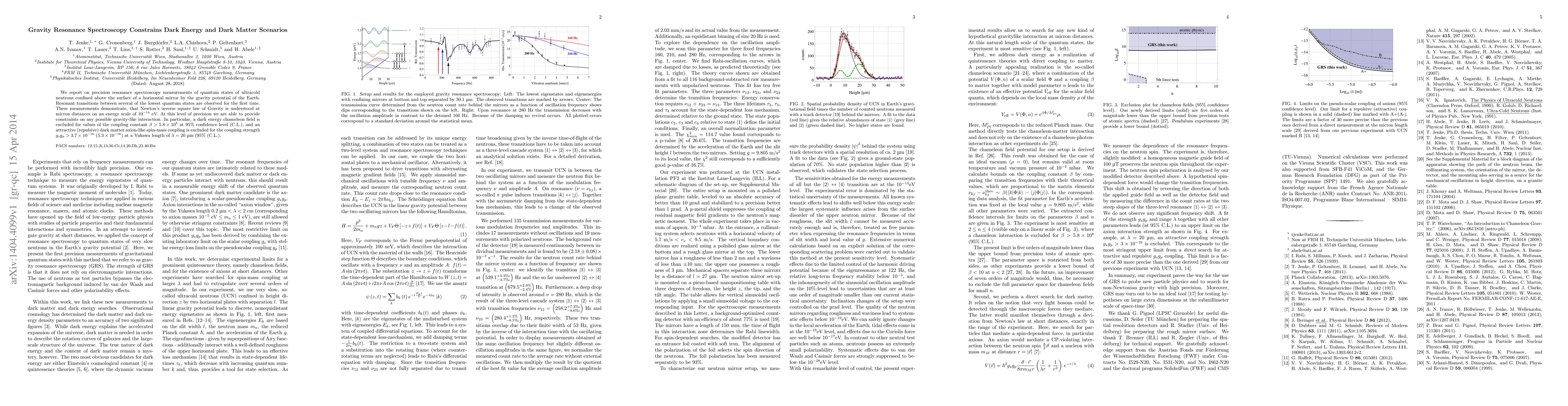 This paper reports precision resonance spectroscopy of ultracold neutrons, providing constraints on dark energy and dark matter interactions. The study excludes a dark energy chameleon field for coupling constants above $5.8\times10^8$ and dark matter axion-like spin-mass coupling for strengths above $3.7\times10^{-16}$ (attractive) and $5.3\times10^{-16}$ (repulsive) at 95% confidence level.