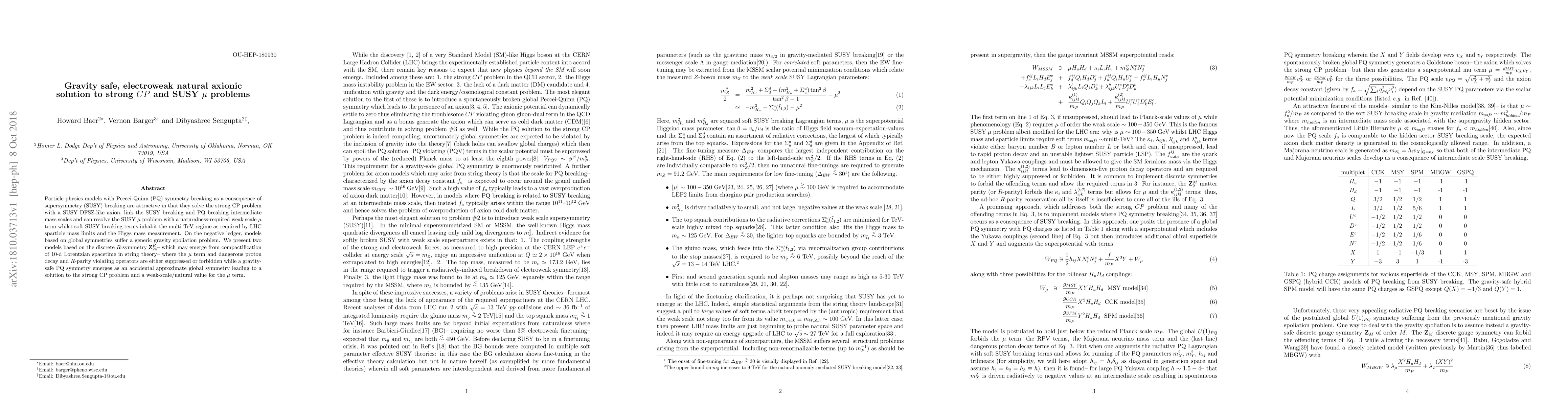This paper proposes a gravity-safe, electroweak natural axionic solution to the strong CP and SUSY mu problems by leveraging discrete R-symmetry in supersymmetric models, ensuring the suppression of unwanted terms while maintaining a viable axion for the strong CP problem and a natural weak-scale mu term.