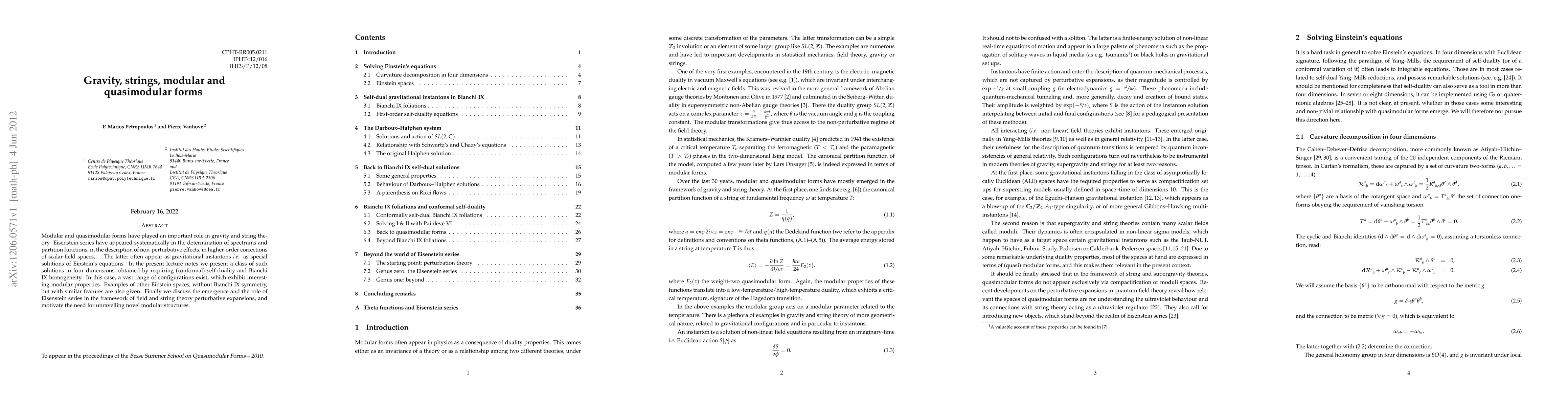 This paper explores the role of modular and quasimodular forms in gravity and string theory, focusing on the appearance of Eisenstein series in spectrums, partition functions, and non-perturbative effects. It presents a class of four-dimensional gravitational instantons characterized by conformal self-duality and Bianchi IX homogeneity, highlighting their modular properties and discussing the broader implications for field and string theory.