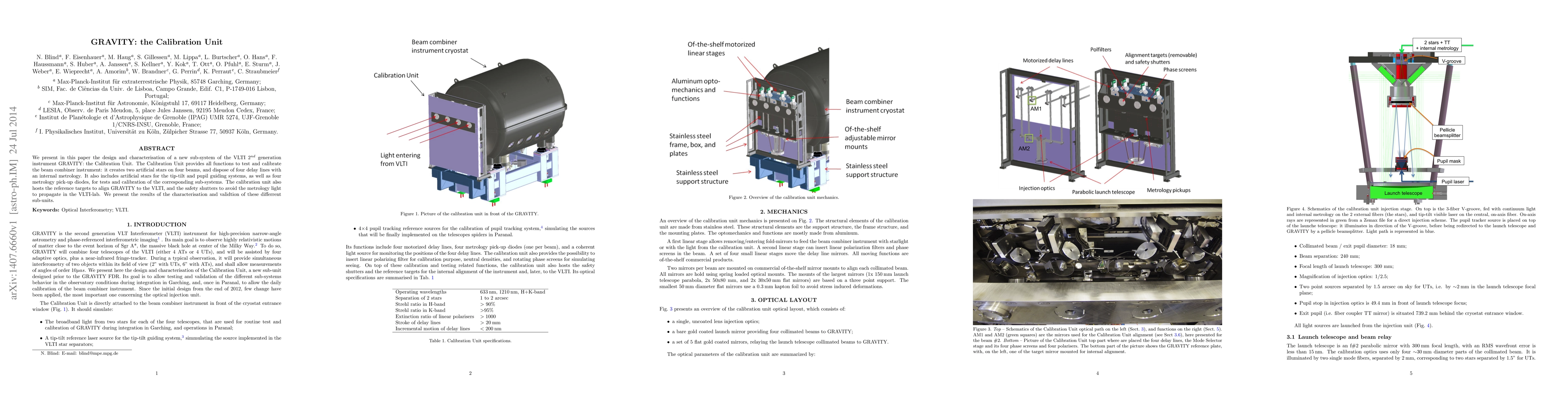 We present in this paper the design and characterisation of a new sub-system of the VLTI 2nd generation instrument GRAVITY: the Calibration Unit. The Calibration Unit provides all functions to test and calibrate the beam combiner instrument: it creates two artificial stars on four beams, and dispose of four delay lines with an internal metrology. It also includes artificial stars for the tip-tilt and pupil guiding systems, as well as four metrology pick-up diodes, for tests and calibration of the corresponding sub-systems. The calibration unit also hosts the reference targets to align GRAVITY to the VLTI, and the safety shutters to avoid the metrology light to propagate in the VLTI-lab. We present the results of the characterisation and validtion of these differrent sub-units.