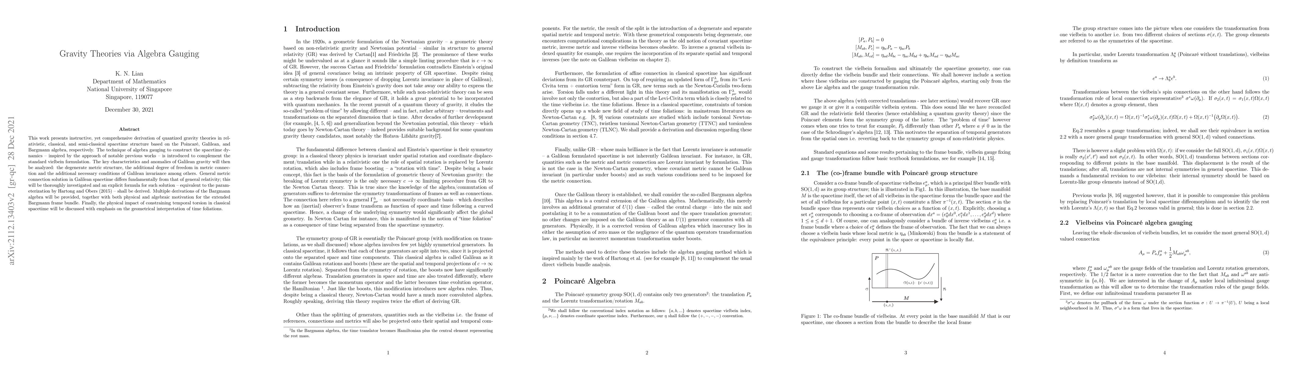 This work presents instructive, yet comprehensive derivation of quantized gravity theories in relativistic, classical, and semi-classical spacetime structure based on the Poincar\'e, Galilean, and Bargmann algebra, respectively. The technique of algebra gauging to construct the spacetime dynamics - inspired by the approach of notable previous works - is introduced to complement the standard vielbein formulation. The key characteristics and anomalies of Galilean gravity will then be analyzed: the degenerate metric structure, the additional degree of freedom in metric connection and the additional necessary conditions of Galilean invariance among others. General metric connection solution in Galilean spacetime differs fundamentally from that of general relativity; this will be thoroughly investigated and an explicit formula for such solution - equivalent to the parameterization by Hartong and Obers (2015) - shall be derived. Multiple derivations of the Bargmann algebra will be provided, together with both physical and algebraic motivation for the extended Bargmann frame bundle. Finally, the physical impact of constraining temporal torsion in classical spacetime will be discussed with emphasis on the geometrical interpretation of time foliations.