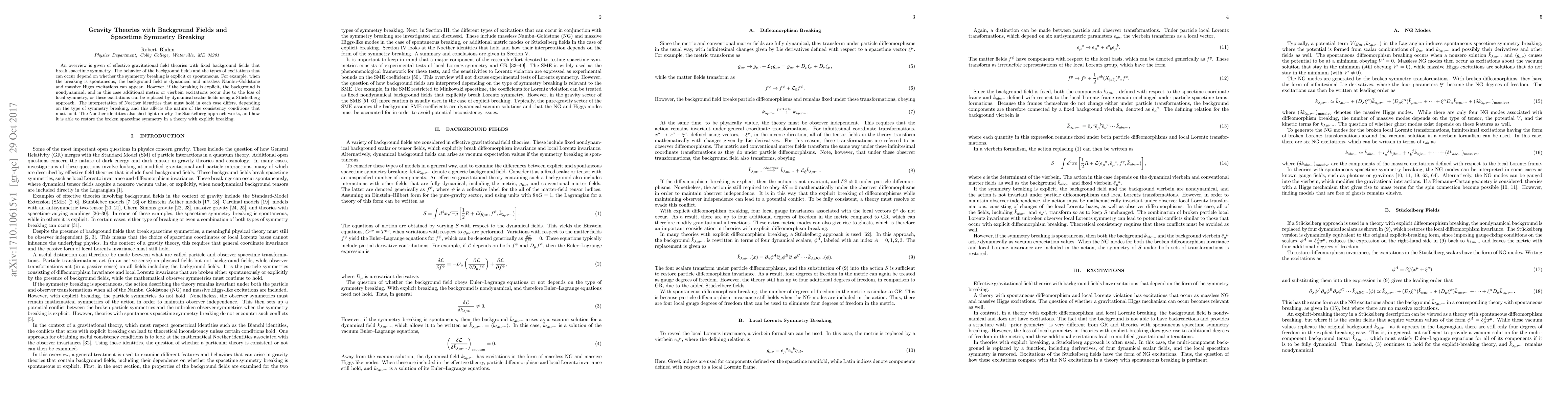 An overview is given of effective gravitational field theories with fixed background fields that break spacetime symmetry. The behavior of the background fields and the types of excitations that can occur depend on whether the symmetry breaking is explicit or spontaneous. For example, when the breaking is spontaneous, the background field is dynamical and massless Nambu--Goldstone and massive Higgs excitations can appear. However, if the breaking is explicit, the background is nondynamical, and in this case additional metric or vierbein excitations occur due to the loss of local symmetry, or these excitations can be replaced by dynamical scalar fields using a Stuckelberg approach. The interpretation of Noether identities that must hold in each case differs, depending on the type of symmetry breaking, and this affects the nature of the consistency conditions that must hold. The Noether identities also shed light on why the Stuckelberg approach works, and how it is able to restore the broken spacetime symmetry in a theory with explicit breaking.