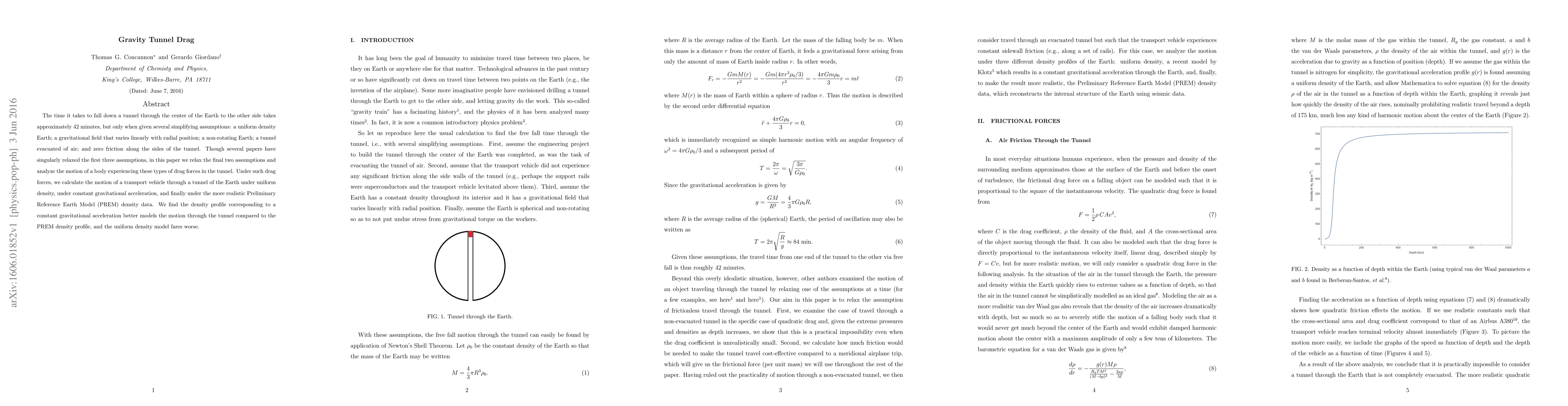 Researchers analyzed the motion of a vehicle through an Earth tunnel with simplified drag forces, finding that a uniform density model performs poorly compared to models based on real-world gravitational acceleration data.