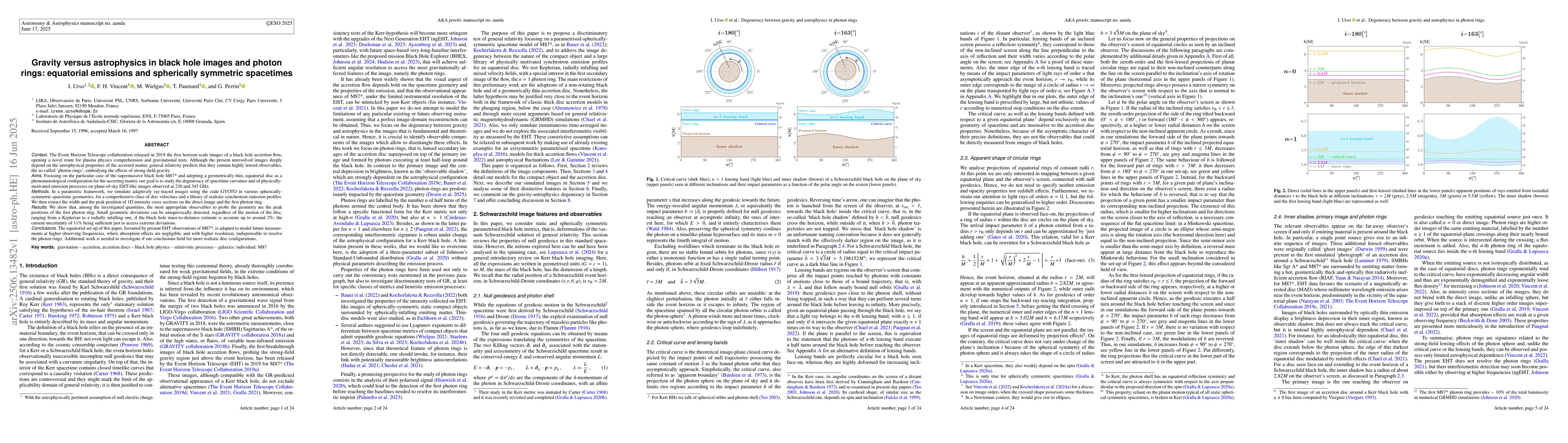 The EHT collaboration released in 2019 the first horizon-scale images of a black hole accretion flow, opening a novel route for plasma physics comprehension and gravitational tests. Although the present unresolved images deeply depend on the astrophysical properties of the accreted matter, GR predicts that they contain highly lensed observables, the "photon rings", embodying the effects of strong-field gravity. Focusing on the supermassive black hole M87* and adopting a geometrically thin, equatorial disc as a phenomenological configuration for the accreting matter, our goal is to study the degeneracy of spacetime curvature and of physically-motivated emission processes on EHT-like images observed at 230 and 345 GHz. In a parametric framework, we simulate adaptively ray-traced images using GYOTO in various spherically-symmetric spacetime geometries, for a comprehensive class of disc velocities and realistic synchrotron emission profiles. We then extract the width and the peak position of 1D intensity cross sections on the direct image and the first photon ring. We show that, among the investigated quantities, the most appropriate observables to probe the geometry are the peak positions of the first photon ring. Small geometric deviations can be unequivocally detected, regardless of the motion of the disc, ranging from a Keplerian to a radially infalling one, if the black hole mass-to-distance estimate is accurate up to around 2%; the current uncertainty of 11% being sufficient just to access extreme deviations. The equatorial set-up of this paper, favoured by present EHT observations of M87*, is adapted to model future measurements at higher observing frequencies, where absorption effects are negligible, and with higher resolution, indispensable to resolve the photon rings. Additional work is needed to investigate if our conclusions hold for more realistic disc configurations.