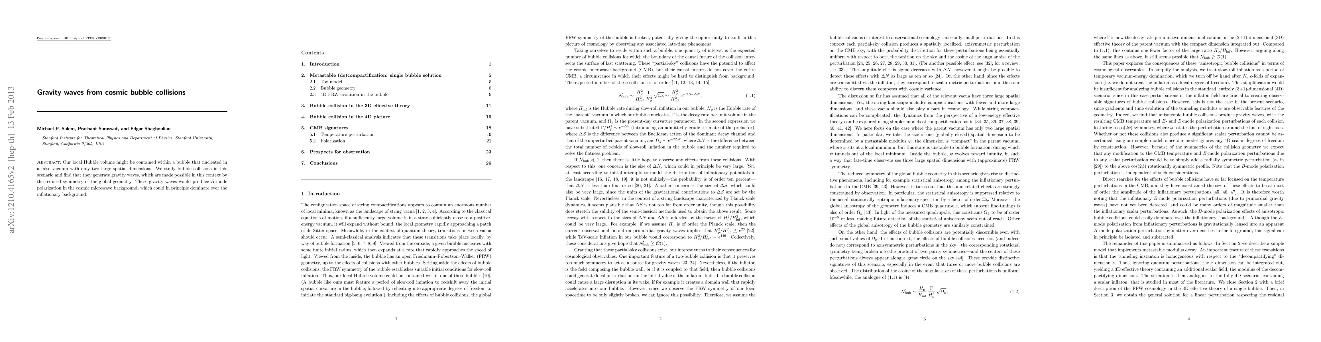 This paper investigates the generation of gravity waves from cosmic bubble collisions within a local Hubble volume, suggesting that such collisions could occur in a false vacuum with reduced spatial dimensions. These gravity waves could produce B-mode polarization in the cosmic microwave background, potentially overshadowing the inflationary background.