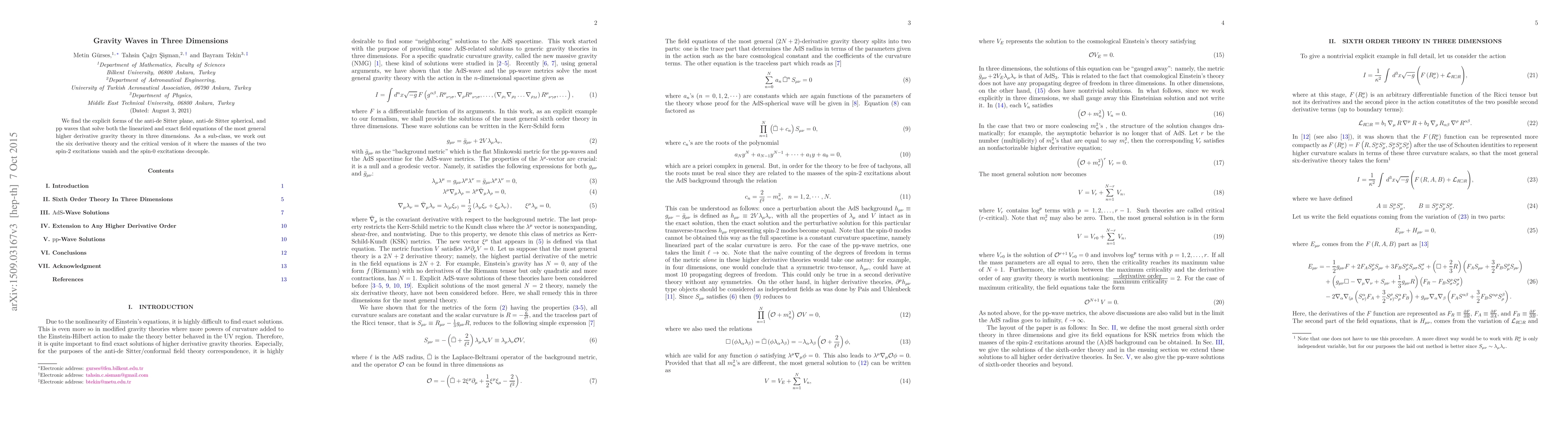 We find the explicit forms of the anti-de Sitter plane, anti-de Sitter spherical, and pp waves that solve both the linearized and exact field equations of the most general higher derivative gravity theory in three dimensions. As a sub-class, we work out the six derivative theory and the critical version of it where the masses of the two spin-2 excitations vanish and the spin-0 excitations decouple.