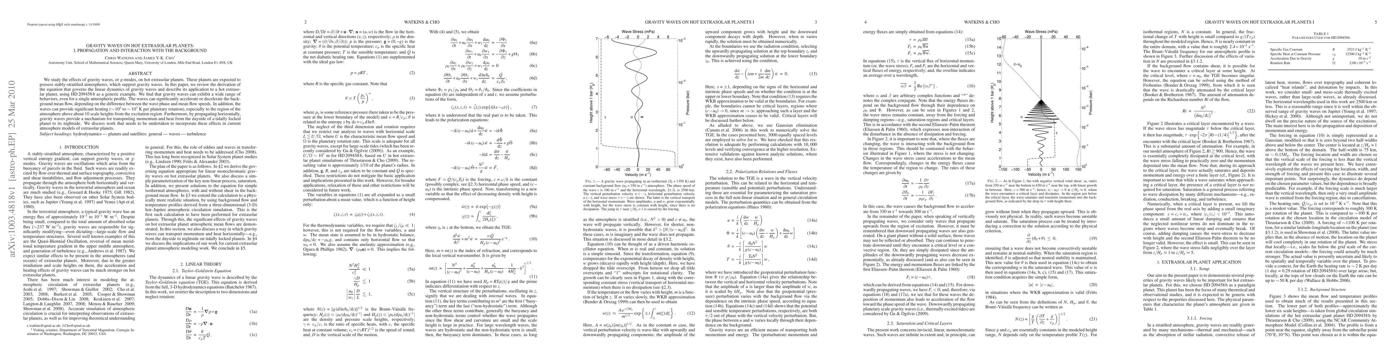 We study the effects of gravity waves, or g-modes, on hot extrasolar planets. These planets are expected to possess stably-stratified atmospheres, which support gravity waves. In this paper, we review the derivation of the equation that governs the linear dynamics of gravity waves and describe its application to a hot extrasolar planet, using HD209458 b as a generic example. We find that gravity waves can exhibit a wide range of behaviors, even for a single atmospheric profile. The waves can significantly accelerate or decelerate the background mean flow, depending on the difference between the wave phase and mean flow speeds. In addition, the waves can provide significant heating (~100 to ~1000 K per planetary rotation), especially to the region of the atmosphere above about 10 scale heights from the excitation region. Furthermore, by propagating horizontally, gravity waves provide a mechanism for transporting momentum and heat from the dayside of a tidally locked planet to its nightside. We discuss work that needs to be undertaken to incorporate these effects in current atmosphere models of extrasolar planets.