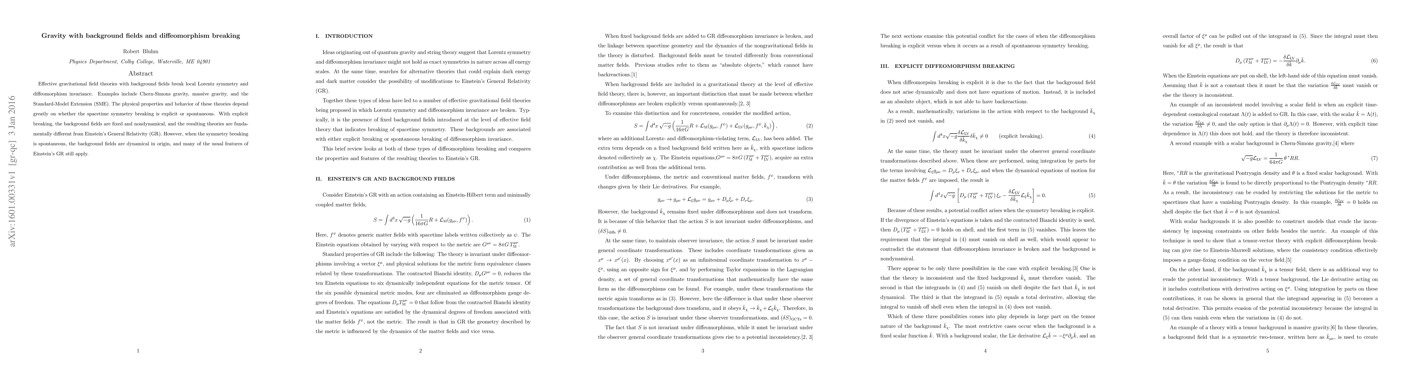 Effective gravitational field theories with background fields break local Lorentz symmetry and diffeomorphism invariance. Examples include Chern-Simons gravity, massive gravity, and the Standard-Model Extension (SME). The physical properties and behavior of these theories depend greatly on whether the spacetime symmetry breaking is explicit or spontaneous. With explicit breaking, the background fields are fixed and nondynamical, and the resulting theories are fundamentally different from Einstein's General Relativity (GR). However, when the symmetry breaking is spontaneous, the background fields are dynamical in origin, and many of the usual features of Einstein's GR still apply.