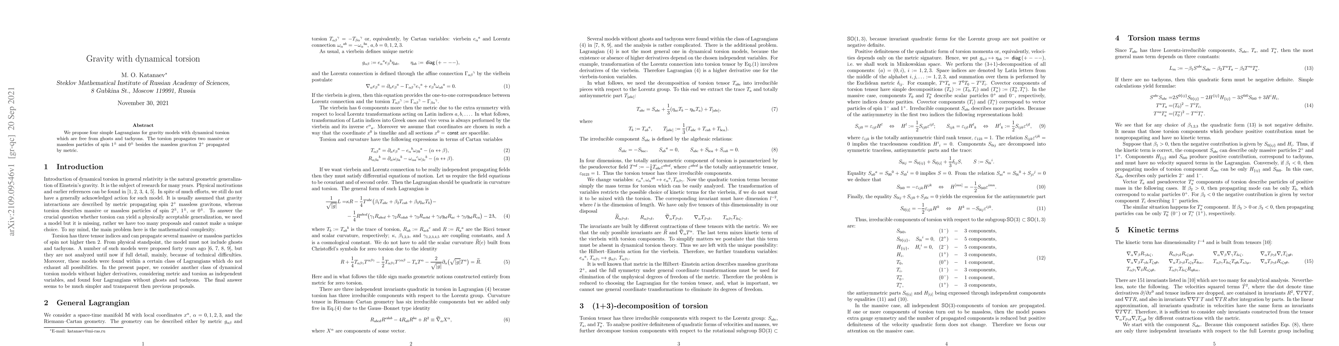 Summary: This paper proposes four Lagrangian models for gravity incorporating dynamical torsion, free from ghosts and tachyons, where torsion introduces two types of spin particles (1± and 0±) alongside the metric-propagated graviton.