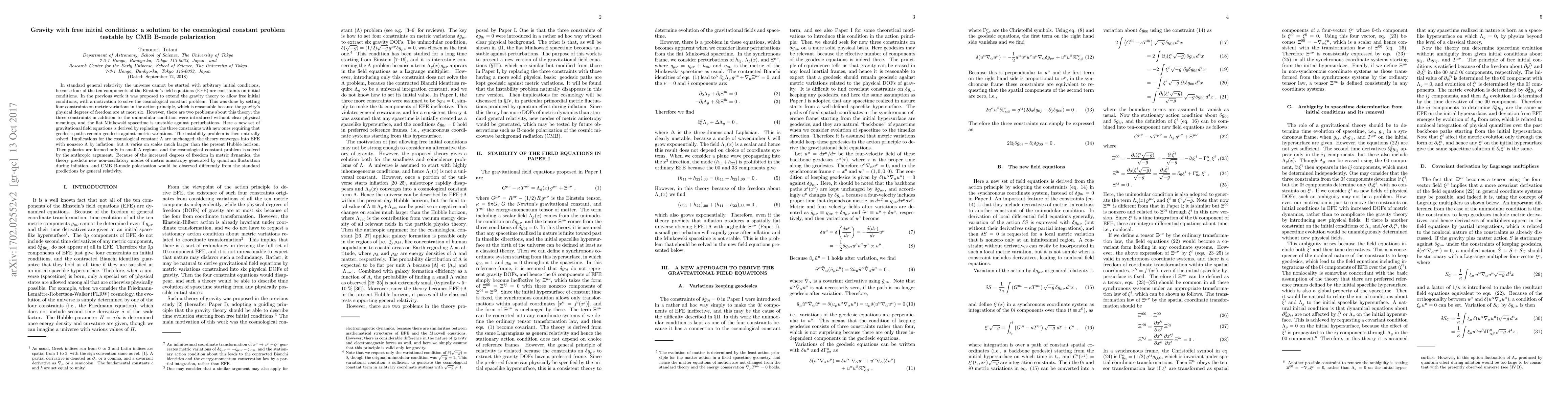 In standard general relativity the universe cannot be started with arbitrary initial conditions, because four of the ten components of the Einstein's field equations (EFE) are constraints on initial conditions. In the previous work it was proposed to extend the gravity theory to allow free initial conditions, with a motivation to solve the cosmological constant problem. This was done by setting four constraints on metric variations in the action principle, which is reasonable because the gravity's physical degrees of freedom are at most six. However, there are two problems about this theory; the three constraints in addition to the unimodular condition were introduced without clear physical meanings, and the flat Minkowski spacetime is unstable against perturbations. Here a new set of gravitational field equations is derived by replacing the three constraints with new ones requiring that geodesic paths remain geodesic against metric variations. The instability problem is then naturally solved. Implications for the cosmological constant $\Lambda$ are unchanged; the theory converges into EFE with nonzero $\Lambda$ by inflation, but $\Lambda$ varies on scales much larger than the present Hubble horizon. Then galaxies are formed only in small $\Lambda$ regions, and the cosmological constant problem is solved by the anthropic argument. Because of the increased degrees of freedom in metric dynamics, the theory predicts new non-oscillatory modes of metric anisotropy generated by quantum fluctuation during inflation, and CMB B-mode polarization would be observed differently from the standard predictions by general relativity.