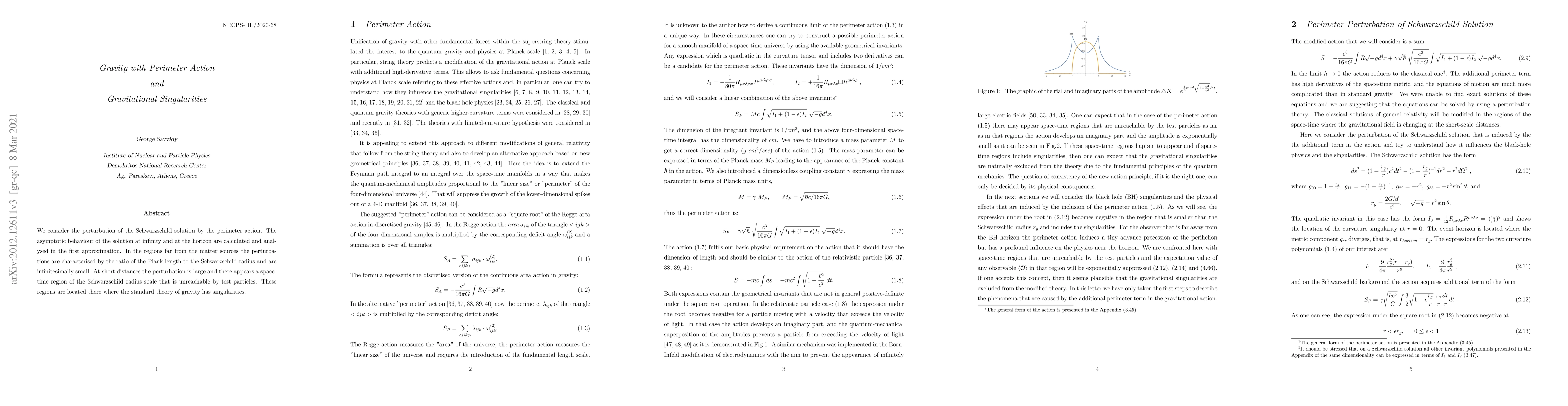 We consider the perturbation of the Schwarzschild solution by the perimeter action. The asymptotic behaviour of the solution at infinity and at the horizon are calculated and analysed in the first approximation. The perturbation is characterised by the ratio of the Plank length to the Schwarzschild radius. It is demonstrated that in the modified theory appear space-time regions of the Schwarzschild radius scale that are unreachable by test particles. These regions are located in the places where standard theory of gravity has singularities.