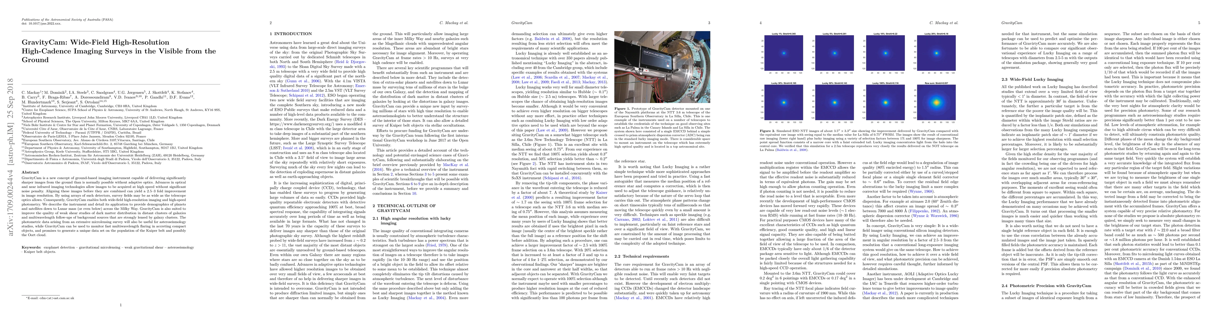 GravityCam is a new concept of ground-based imaging instrument capable of delivering significantly sharper images from the ground than is normally possible without adaptive optics. Advances in optical and near infrared imaging technologies allow images to be acquired at high speed without significant noise penalty. Aligning these images before they are combined can yield a 2.5 to 3 fold improvement in image resolution. By using arrays of such detectors, survey fields may be as wide as the telescope optics allows. Consequently, GravityCam enables both wide-field high-resolution imaging and high-speed photometry. We describe the instrument and detail its application to provide demographics of planets and satellites down to Lunar mass (or even below) across the Milky Way. GravityCam is also suited to improve the quality of weak shear studies of dark matter distribution in distant clusters of galaxies and multiwavelength follow-ups of background sources that are strongly lensed by galaxy clusters. The photometric data arising from an extensive microlensing survey will also be useful for asteroseismology studies, while GravityCam can be used to monitor fast multiwavelength flaring in accreting compact objects, and promises to generate a unique data set on the population of the Kuiper belt and possibly the Oort cloud.