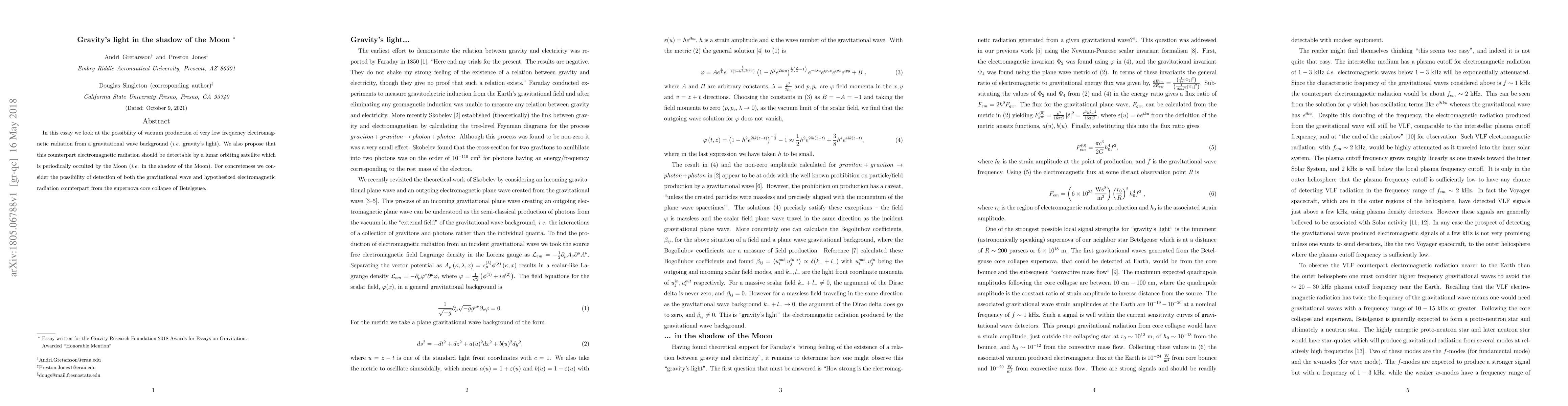 In this essay we look at the possibility of vacuum production of very low frequency electromagnetic radiation from a gravitational wave background (i.e. gravity's light). We also propose that this counterpart electromagnetic radiation should be detectable by a lunar orbiting satellite which is periodically occulted by the Moon (i.e. in the shadow of the Moon). For concreteness we consider the possibility of detection of both the gravitational wave and hypothesized electromagnetic radiation counterpart from the supernova core collapse of Betelgeuse.