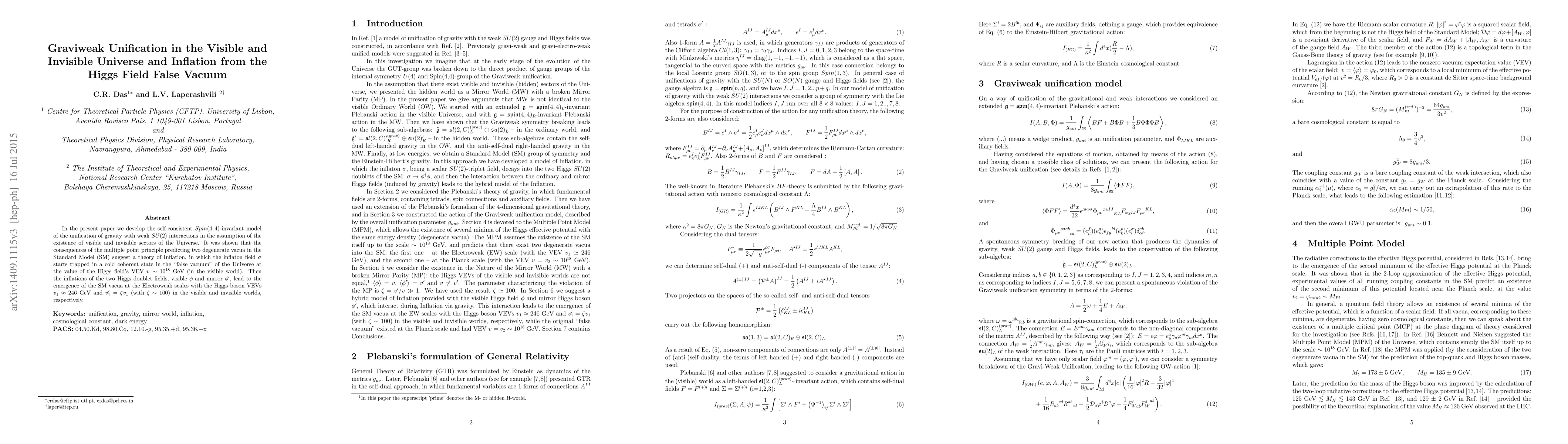 This paper proposes a $Spin(4,4)$-invariant model unifying gravity with weak interactions, considering both visible and invisible sectors of the universe. It suggests an inflationary theory where the inflaton field $\sigma$ initiates from a false vacuum state, leading to Electroweak scale vacuums for visible and invisible Higgs fields.