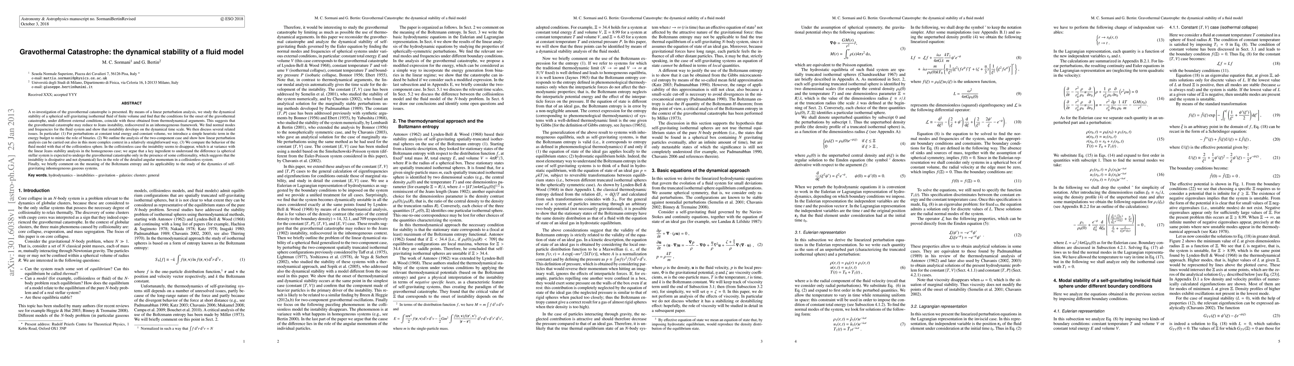 Researchers investigate the gravothermal catastrophe in a fluid model, finding that it coincides with Jeans instability under different external conditions and occurs on a dynamical time scale. They also explore related issues, including binary systems and collisionless spheres.