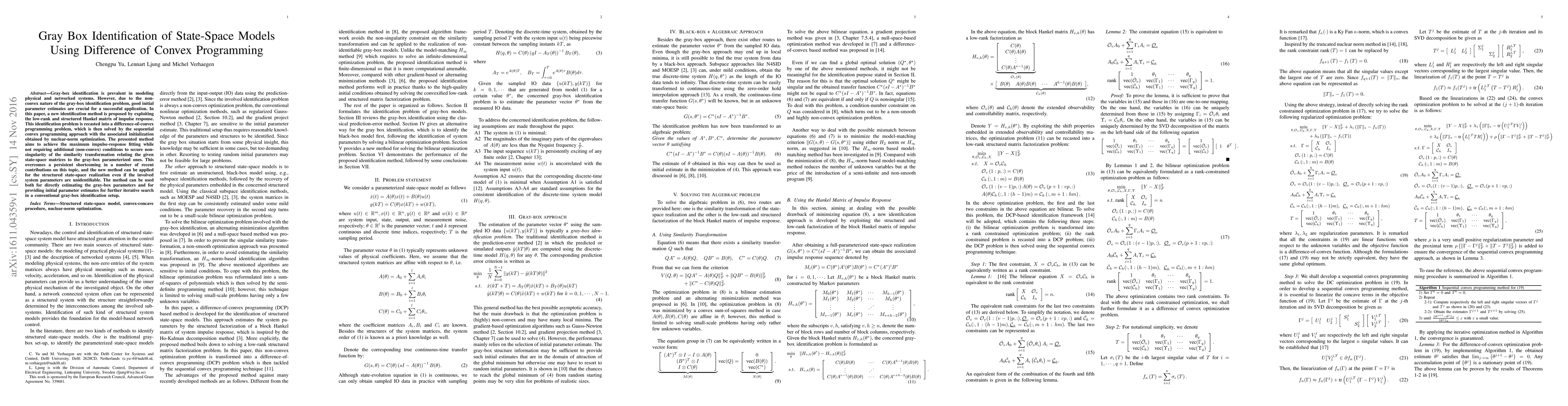 This paper proposes a new method for gray-box identification of state-space models using difference-of-convex programming, leveraging the low-rank Hankel matrix of impulse response. The method recasts the identification problem into a convex optimization problem, achieving optimal impulse-response fitting without requiring additional non-convex conditions.
