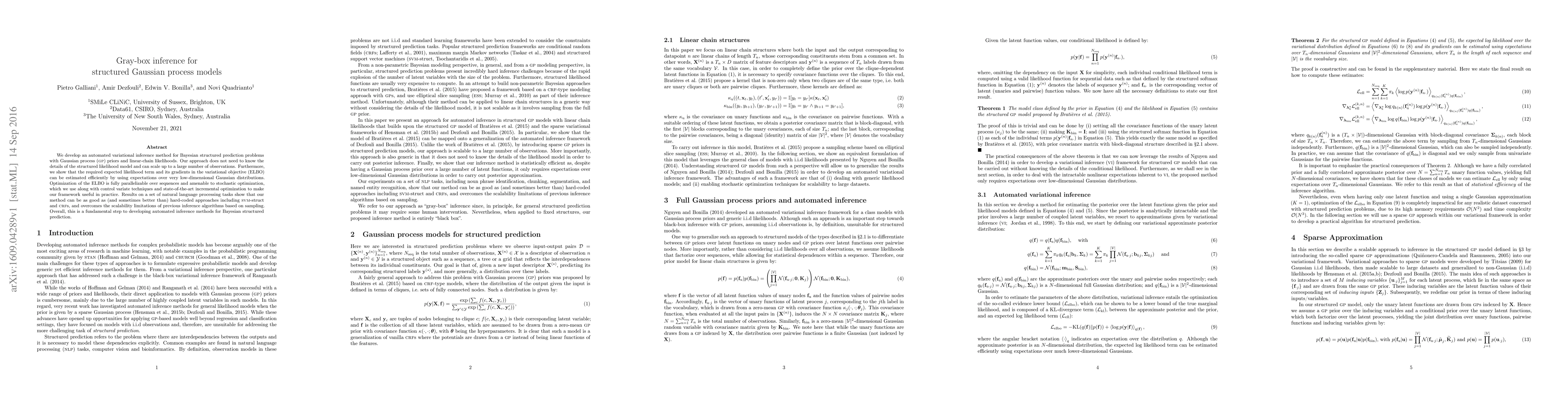 We develop an automated variational inference method for Bayesian structured prediction problems with Gaussian process (GP) priors and linear-chain likelihoods. Our approach does not need to know the details of the structured likelihood model and can scale up to a large number of observations. Furthermore, we show that the required expected likelihood term and its gradients in the variational objective (ELBO) can be estimated efficiently by using expectations over very low-dimensional Gaussian distributions. Optimization of the ELBO is fully parallelizable over sequences and amenable to stochastic optimization, which we use along with control variate techniques and state-of-the-art incremental optimization to make our framework useful in practice. Results on a set of natural language processing tasks show that our method can be as good as (and sometimes better than) hard-coded approaches including SVM-struct and CRFs, and overcomes the scalability limitations of previous inference algorithms based on sampling. Overall, this is a fundamental step to developing automated inference methods for Bayesian structured prediction.
