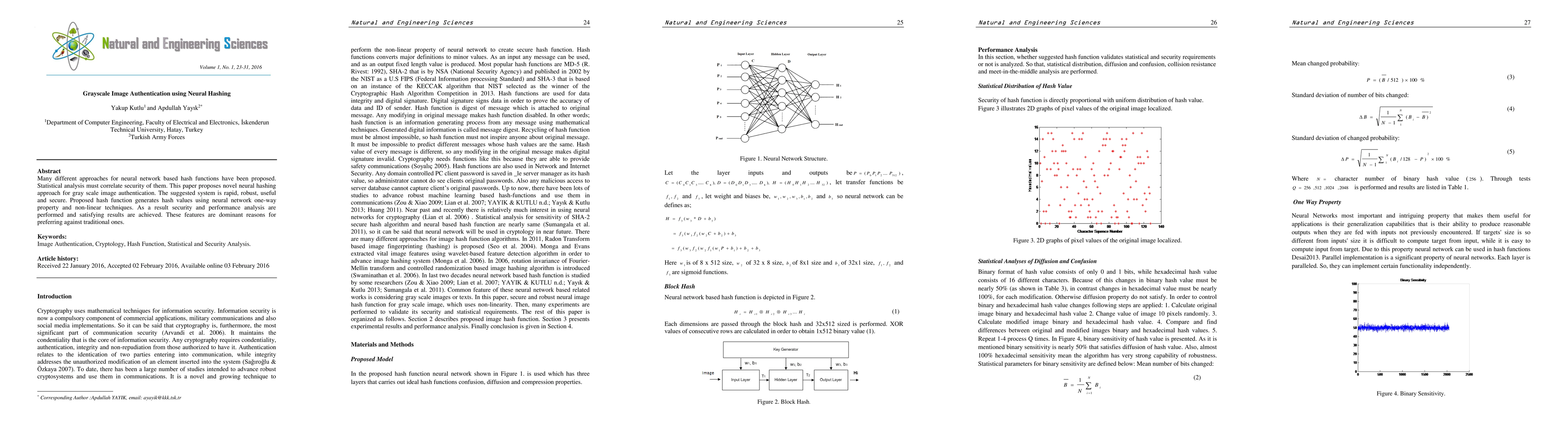 This paper introduces a novel neural hashing method for authenticating grayscale images, leveraging neural network one-way properties and non-linear techniques for rapid, robust, and secure hash value generation. Security and performance analyses demonstrate superior results compared to traditional methods.
