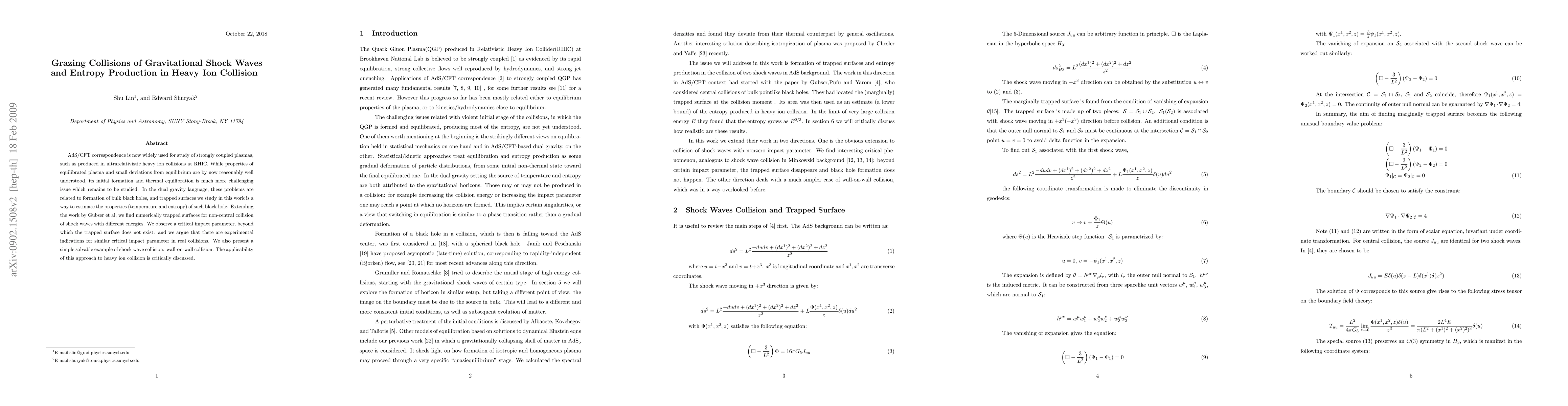 AdS/CFT correspondence is now widely used for study of strongly coupled plasmas, such as produced in ultrarelativistic heavy ion collisions at RHIC. While properties of equilibrated plasma and small deviations from equilibrium are by now reasonably well understood, its initial formation and thermal equilibration is much more challenging issue which remains to be studied. In the dual gravity language, these problems are related to formation of bulk black holes, and trapped surfaces we study in this work is a way to estimate the properties (temperature and entropy) of such black hole. Extending the work by Gubser et al, we find numerically trapped surfaces for non-central collision of shock waves with different energies. We observe a critical impact parameter, beyond which the trapped surface does not exist: and we argue that there are experimental indications for similar critical impact parameter in real collisions. We also present a simple solvable example of shock wave collision: wall-on-wall collision. The applicability of this approach to heavy ion collision is critically discussed.
