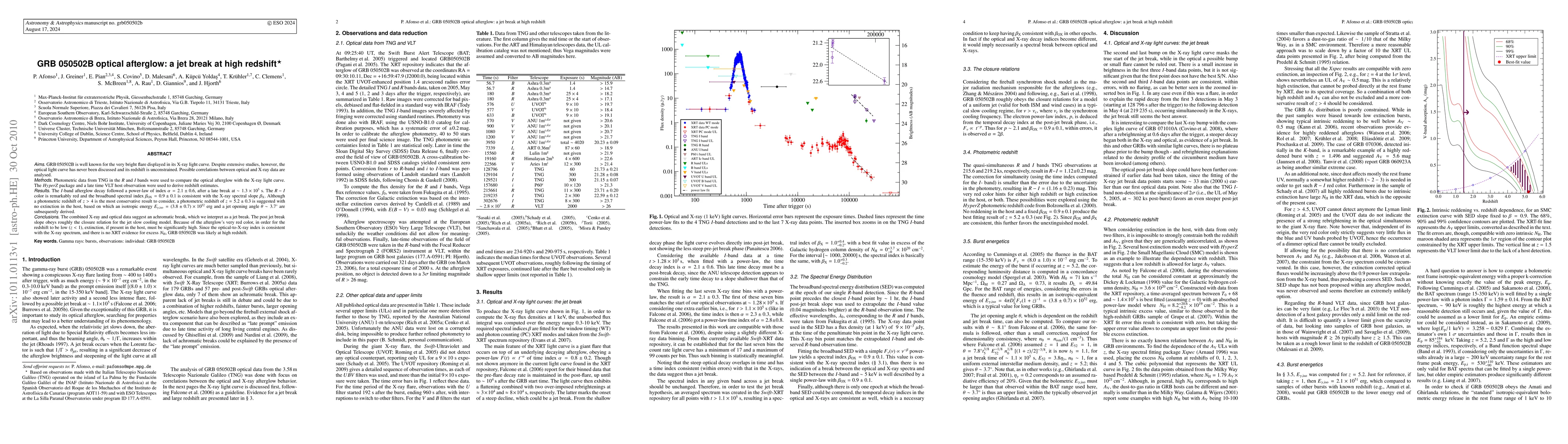 This paper analyzes the optical afterglow of GRB 050502B, revealing a jet break at high redshift. The study finds a photometric redshift of z = 5.2 ± 0.3, suggesting an isotropic energy release and a jet opening angle, while the optical-to-X-ray index supports the high redshift conclusion.