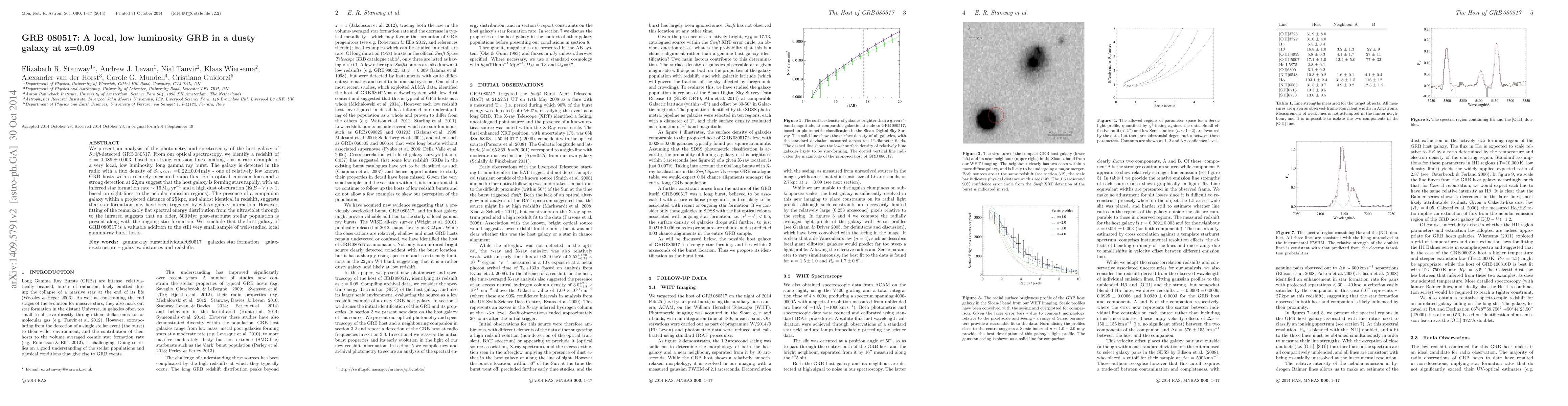 We present an analysis of the photometry and spectroscopy of the host galaxy of Swift-detected GRB 080517. From our optical spectroscopy, we identify a redshift of z = 0.089 +/- 0.003, based on strong emission lines, making this a rare example of a very local, low luminosity, long gamma ray burst. The galaxy is detected in the radio with a flux density of S(4.8GHz) =0.22 +/- 0.04mJy - one of relatively few known GRB hosts with a securely measured radio flux. Both optical emission lines and a strong detection at 22 um suggest that the host galaxy is forming stars rapidly, with an inferred star formation rate ~16 Msun/yr and a high dust obscuration (E(B-V )>1, based on sight-lines to the nebular emission regions). The presence of a companion galaxy within a projected distance of 25 kpc, and almost identical in redshift, suggests that star formation may have been triggered by galaxy-galaxy interaction. However, fitting of the remarkably flat spectral energy distribution from the ultraviolet through to the infrared suggests that an older, 500Myr post-starburst stellar population is present along with the ongoing star formation. We suggest that that the host galaxy of GRB 080517 is a valuable addition to the still very small sample of well-studied local gamma-ray burst hosts.