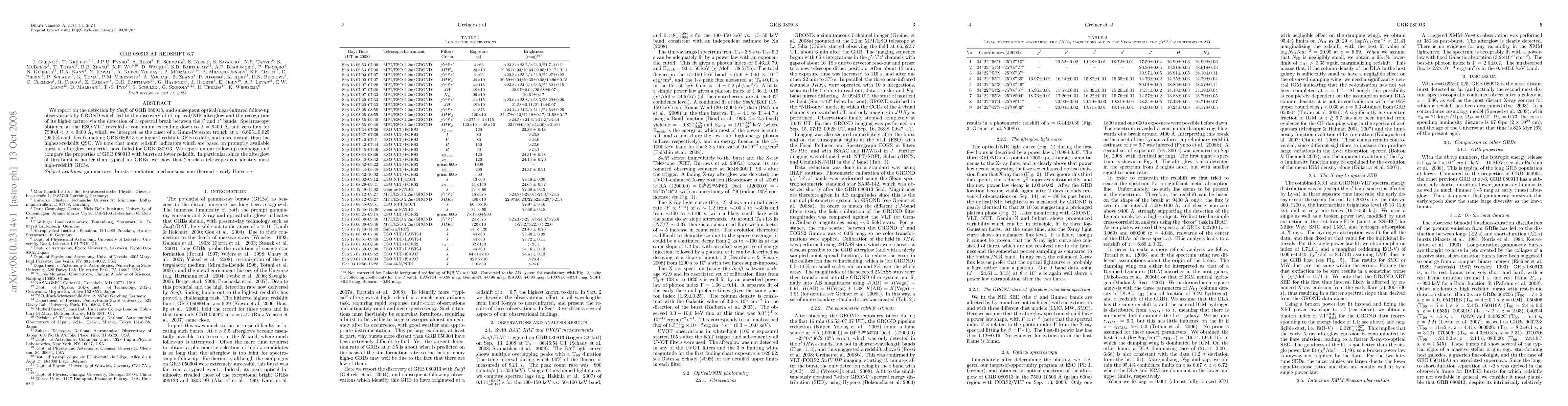 GRB 080913, detected by Swift and followed by GROND, is identified as the highest redshift GRB to date at z=6.7, confirmed by a Gunn-Peterson trough. Its faint afterglow suggests that 2m-class telescopes can detect most high-redshift GRBs.