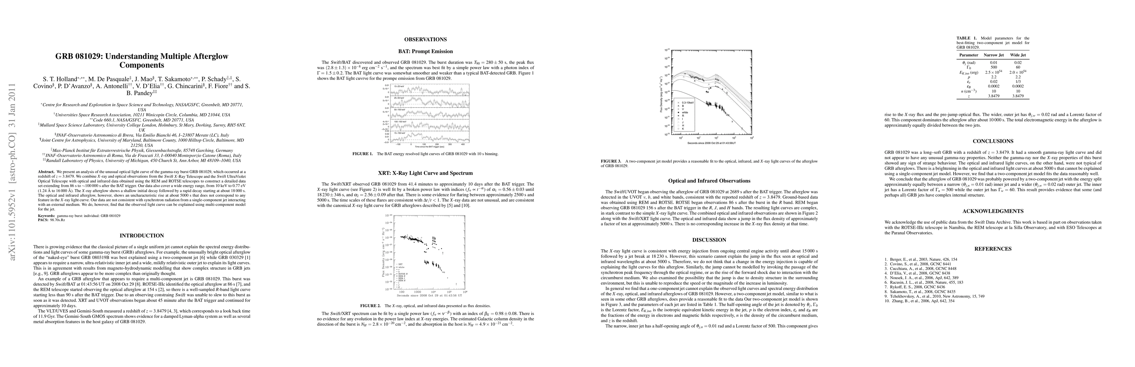 This paper analyzes the complex optical light curve of GRB 081029, revealing a rapid rise in the optical afterglow not mirrored in the X-ray data. The findings suggest that a multi-component jet model better explains the observed behavior than a single-component model.