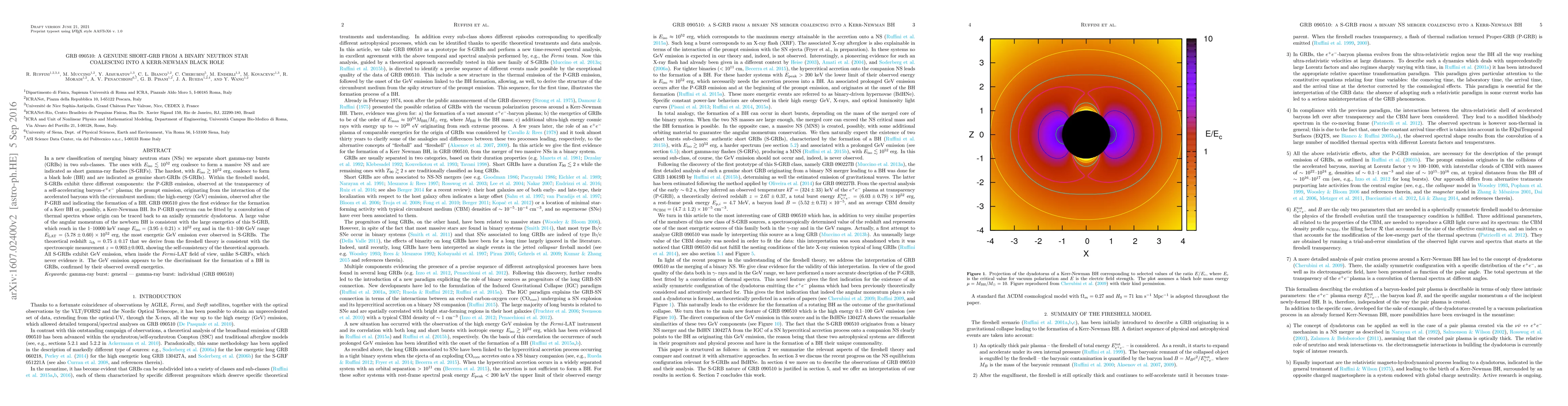 In a new classification of merging binary neutron stars (NSs) we separate short gamma-ray bursts (GRBs) in two sub-classes. The ones with $E_{iso}\lesssim10^{52}$ erg coalesce to form a massive NS and are indicated as short gamma-ray flashes (S-GRFs). The hardest, with $E_{iso}\gtrsim10^{52}$ erg, coalesce to form a black hole (BH) and are indicated as genuine short-GRBs (S-GRBs). Within the fireshell model, S-GRBs exhibit three different components: the P-GRB emission, observed at the transparency of a self-accelerating baryon-$e^+e^-$ plasma; the prompt emission, originating from the interaction of the accelerated baryons with the circumburst medium; the high-energy (GeV) emission, observed after the P-GRB and indicating the formation of a BH. GRB 090510 gives the first evidence for the formation of a Kerr BH or, possibly, a Kerr-Newman BH. Its P-GRB spectrum can be fitted by a convolution of thermal spectra whose origin can be traced back to an axially symmetric dyadotorus. A large value of the angular momentum of the newborn BH is consistent with the large energetics of this S-GRB, which reach in the 1--10000 keV range $E_{iso}=(3.95\pm0.21)\times10^{52}$ erg and in the 0.1--100 GeV range $E_{LAT}=(5.78\pm0.60)\times10^{52}$ erg, the most energetic GeV emission ever observed in S-GRBs. The theoretical redshift $z_{th}=0.75\pm0.17$ that we derive from the fireshell theory is consistent with the spectroscopic measurement $z=0.903\pm0.003$, showing the self-consistency of the theoretical approach. All S-GRBs exhibit GeV emission, when inside the Fermi-LAT field of view, unlike S-GRFs, which never evidence it. The GeV emission appears to be the discriminant for the formation of a BH in GRBs, confirmed by their observed overall energetics.
