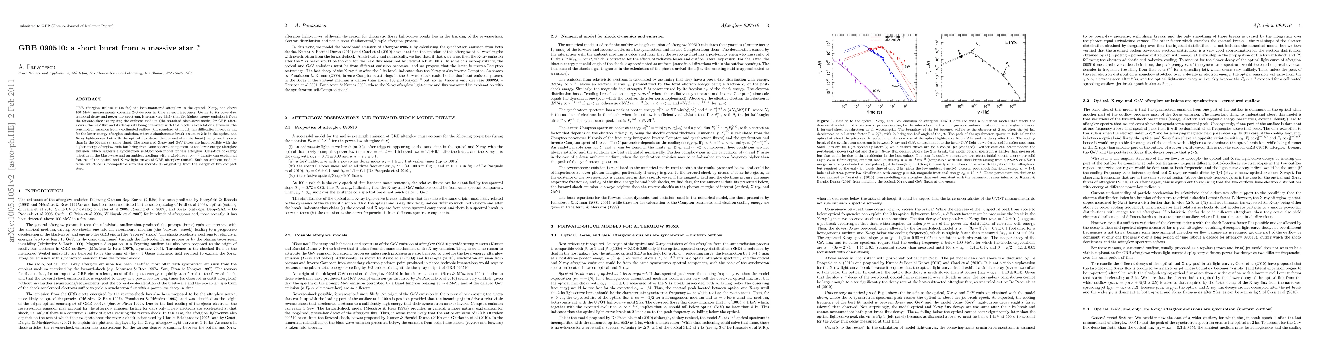 GRB 090510's afterglow exhibits complex temporal and spectral characteristics, suggesting a synchrotron self-Compton model for lower-energy emissions, while the higher-energy GeV flux aligns with the standard blast-wave model. The data imply the burst likely originated from a massive star, not from a compact star merger.