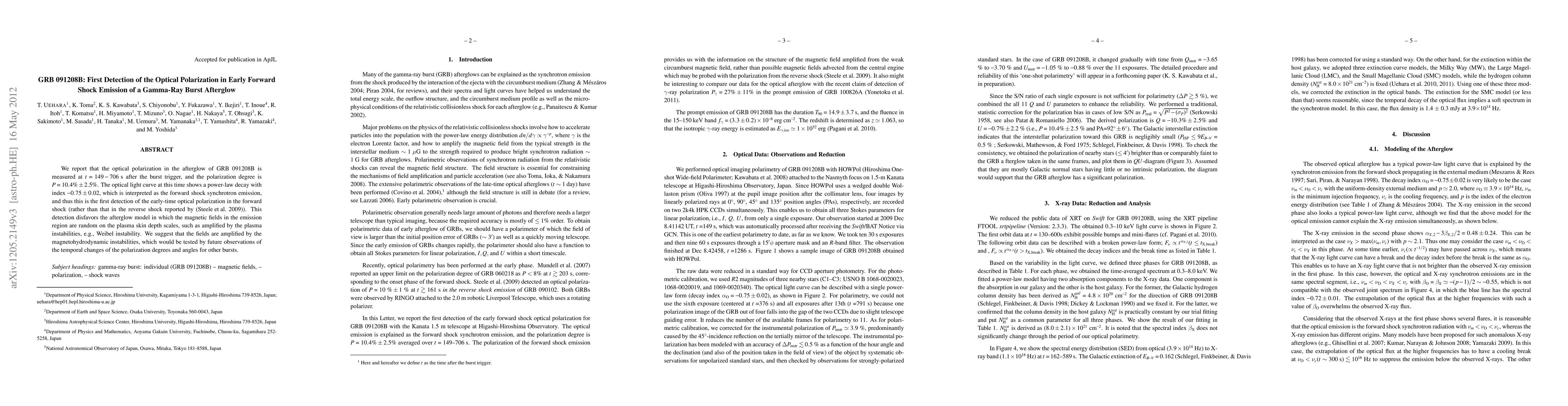 Researchers detected optical polarization in a gamma-ray burst afterglow, revealing a power-law decay with an index of -0.75, and observed a 10.4% polarization degree. This is the first detection of early-time optical polarization in forward shock emission, challenging existing models of magnetic field amplification.