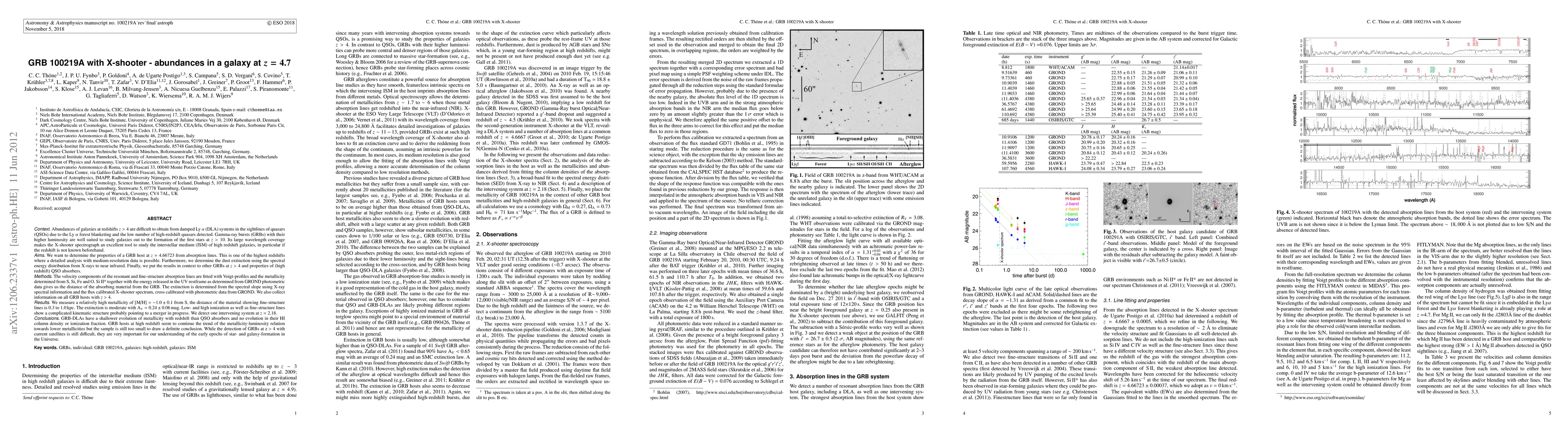 Abundances of galaxies at redshifts z > 4 are difficult to obtain from damped Ly {\alpha} (DLA) systems in the sightlines of quasars (QSOs) due to the Ly {\alpha} forest blanketing and the low number of high-redshift quasars detected. Gamma-ray bursts (GRBs) with their higher luminosity are well suited to study galaxies out to the formation of the first stars at z > 10. Its large wavelength coverage makes the X-shooter spectrograph an excellent tool to study the interstellar medium (ISM) of high redshift galaxies, in particular if the redshift is not known beforehand. Here we determine the properties of a GRB host at z = 4.66723 from a number of resonant low- and high ionization and fine-structure absorption lines. This is one of the highest redshifts where a detailed analysis with medium-resolution data has been possible. We detect one intervening system at z = 2.18. The velocity components of the absorption lines are fitted with Voigt-profiles and we determine a metallicity of [M/H] = -1.0 \pm 0.1 using S. The absorption lines show a complicated kinematic structure which could point to a merger in progress. Si II* together with the restframe UV energy release determined from GROND data gives us the distance of 0.3 to 1 kpc of the absorbing material from the GRB. We measure a low extinction of AV = 0.24 \pm 0.06 mag using X-ray spectral information and the flux calibrated X-shooter spectrum. GRB-DLAs have a shallower evolution of metallicity with redshift than QSO absorbers and no evolution in HI column density or ionization fraction. GRB hosts at high redshift might continue the trend towards lower metallicities in the LZ-relation with redshift, but the sample is still too small to draw a definite conclusion. While the detection of GRBs at z > 4 with current satellites is still difficult, they are very important for our understanding of the early epochs of star- and galaxy-formation.