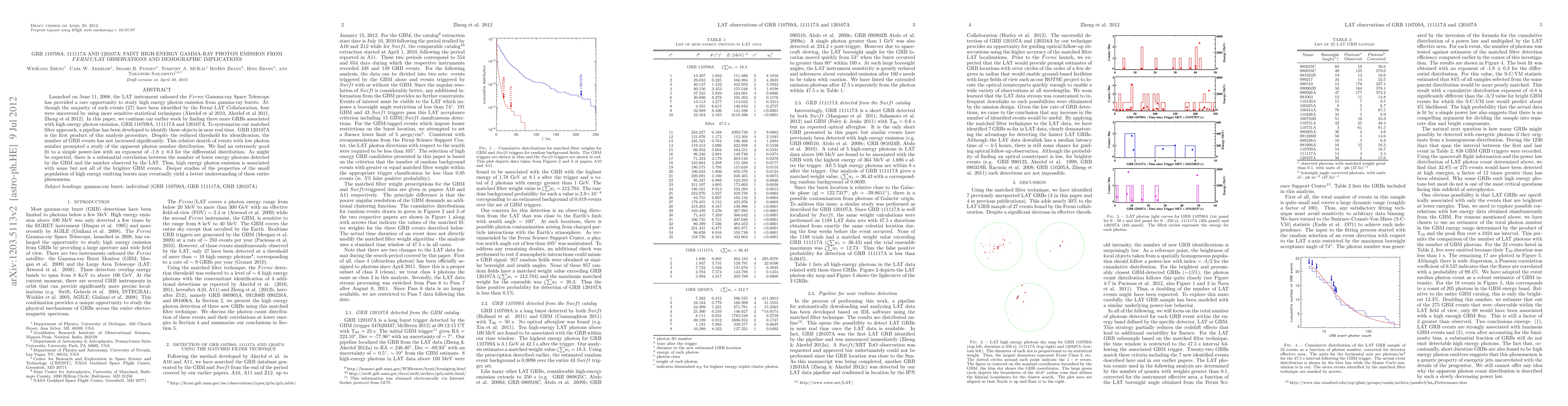 Launched on June 11, 2008, the LAT instrument onboard the $Fermi$ Gamma-ray Space Telescope has provided a rare opportunity to study high energy photon emission from gamma-ray bursts. Although the majority of such events (27) have been iden tified by the Fermi LAT Collaboration, four were uncovered by using more sensiti ve statistical techniques (Akerlof et al 2010, Akerlof et al 2011, Zheng et al 2 012). In this paper, we continue our earlier work by finding three more GRBs ass ociated with high energy photon emission, GRB 110709A, 111117A and 120107A. To s ystematize our matched filter approach, a pipeline has been developed to identif y these objects in near real time. GRB 120107A is the first product of this anal ysis procedure. Despite the reduced threshold for identification, the number of GRB events has not increased significantly. This relative dearth of events with low photon number prompted a study of the apparent photon number distribution. W e find an extremely good fit to a simple power-law with an exponent of -1.8 $\pm $ 0.3 for the differential distribution. As might be expected, there is a substa ntial correlation between the number of lower energy photons detected by the GBM and the number observed by the LAT. Thus, high energy photon emission is associ ated with some but not all of the brighter GBM events. Deeper studies of the pro perties of the small population of high energy emitting bursts may eventually yi eld a better understanding of these entire phenomena.