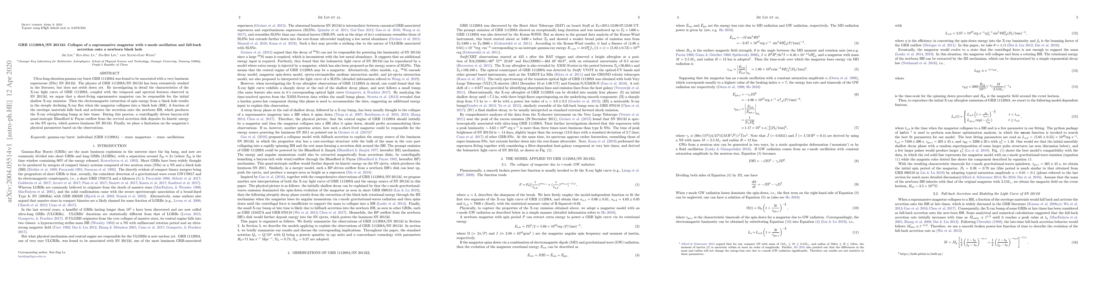 A supramassive magnetar's collapse into a black hole is linked to the ultra-long-duration GRB 111209A and supernovae SN 2011kl, with magnetar collapse triggering X-ray emission and subsequent accretion powering the luminous SN.