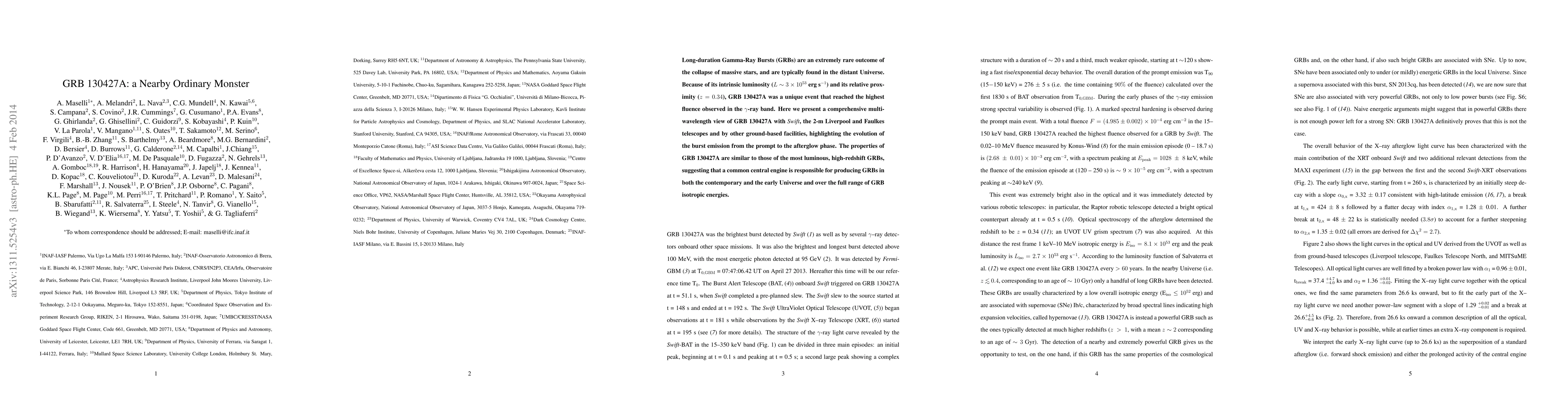 GRB 130427A, a nearby long-duration gamma-ray burst, offers a rare glimpse into the properties of luminous, high-redshift GRBs, suggesting a common central engine mechanism across different cosmic epochs. Observations from Swift and ground-based telescopes detail its evolution from prompt to afterglow phase.