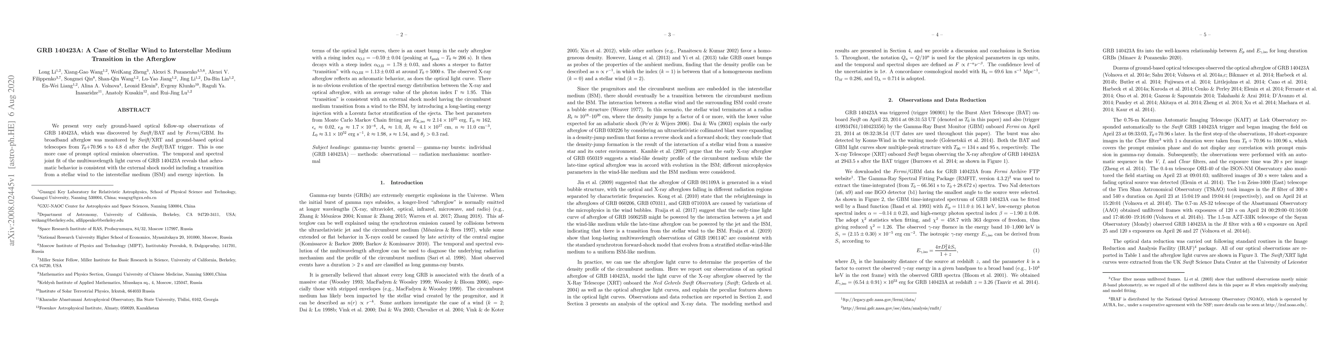 We present very early ground-based optical follow-up observations of GRB~140423A, which was discovered by \emph{Swift}/BAT and by {\it Fermi}/GBM. Its broadband afterglow was monitored by {\it Swift}/XRT and ground-based optical telescopes from $T_0+$70.96~s to 4.8~d after the {\it Swift}/BAT trigger. This is one more case of prompt optical emission observation. The temporal and spectral joint fit of the multiwavelength light curves of GRB 140423A reveals that achromatic behavior is consistent with the external shock model including a transition from a stellar wind to the interstellar medium (ISM) and energy injection. In terms of the optical light curves, there is an onset bump in the early afterglow with a rising index $\alpha_{\rm O,I} = -0.59 \pm 0.04$ (peaking at $t_{\rm peak}-T_0 \approx 206$~s). It then decays with a steep index $\alpha_{\rm O,II} = 1.78 \pm 0.03$, and shows a steeper to flatter "transition" with $\alpha_{\rm O,III} = 1.13 \pm 0.03$ at around $T_0 + 5000$~s. The observed X-ray afterglow reflects an achromatic behavior, as does the optical light curve. There is no obvious evolution of the spectral energy distribution between the X-ray and optical afterglow, with an average value of the photon index $\Gamma \approx 1.95$. This "transition" is consistent with an external shock model having the circumburst medium transition from a wind to the ISM, by introducing a long-lasting energy injection with a Lorentz factor stratification of the ejecta. The best parameters from Monte Carlo Markov Chain fitting are $E_{\rm K,iso} \approx 2.14\times10^{55}$ erg, $\Gamma_0 \approx 162$, $\epsilon_e \approx 0.02$, $\epsilon_B \approx 1.7\times10^{-6}$, $A_\ast \approx 1.0$, $R_t \approx 4.1\times10^{17}$ cm, $n \approx 11.0 \rm\ cm^{-3}$, $L_0 \approx 3.1\times10^{52} \rm\ erg\ s^{-1}$, $k \approx 1.98$, $s \approx 1.54$, and $\theta_j > 0.3$ rad.