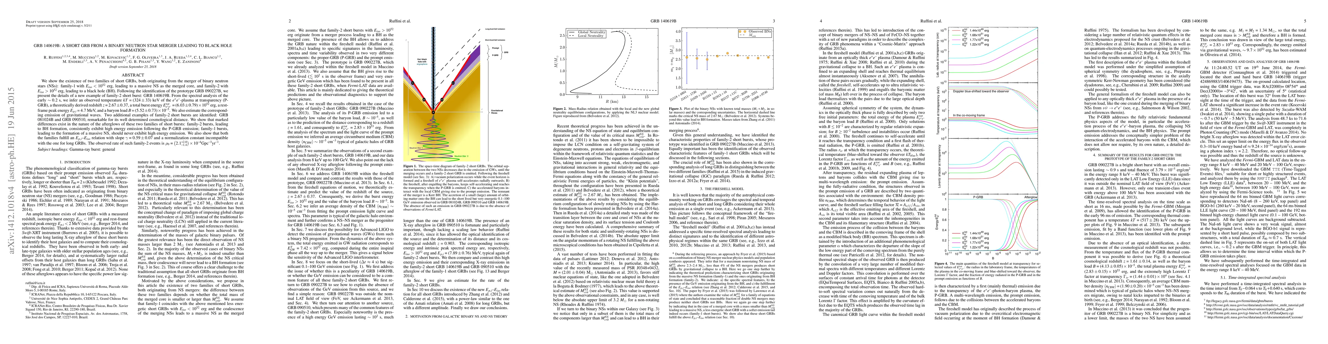 We show the existence of two families of short GRBs, both originating from the merger of binary neutron stars (NSs): family-1 with $E_{iso}<10^{52}$ erg, leading to a massive NS as the merged core, and family-2 with $E_{iso}>10^{52}$ erg, leading to a black hole (BH). Following the identification of the prototype GRB 090227B, we present the details of a new example of family-2 short burst: GRB 140619B. From the spectral analysis of the early $\sim0.2$ s, we infer an observed temperature $kT =(324\pm33)$ keV of the $e^+e^-$-plasma at transparency (P-GRB), a theoretically derived redshift $z=2.67\pm0.37$, a total burst energy $E^{tot}_{e^+e^-}=(6.03\pm0.79)\times10^{52}$ erg, a rest-frame peak energy $E_{p,i}=4.7$ MeV, and a baryon load $B=(5.52\pm0.73)\times10^{-5}$. We also estimate the corresponding emission of gravitational waves. Two additional examples of family-2 short bursts are identified: GRB 081024B and GRB 090510, remarkable for its well determined cosmological distance. We show that marked differences exist in the nature of the afterglows of these two families of short bursts: family-2 bursts, leading to BH formation, consistently exhibit high energy emission following the P-GRB emission; family-1 bursts, leading to the formation of a massive NS, should never exhibit high energy emission. We also show that both the families fulfill an $E_{p,i}$--$E_{iso}$ relation with slope $\gamma=0.59\pm0.07$ and a normalization constant incompatible with the one for long GRBs. The observed rate of such family-2 events is $\rho_0=\left(2.1^{+2.8}_{-1.4}\right)\times10^{-4}$Gpc$^{-3}$yr$^{-1}$.