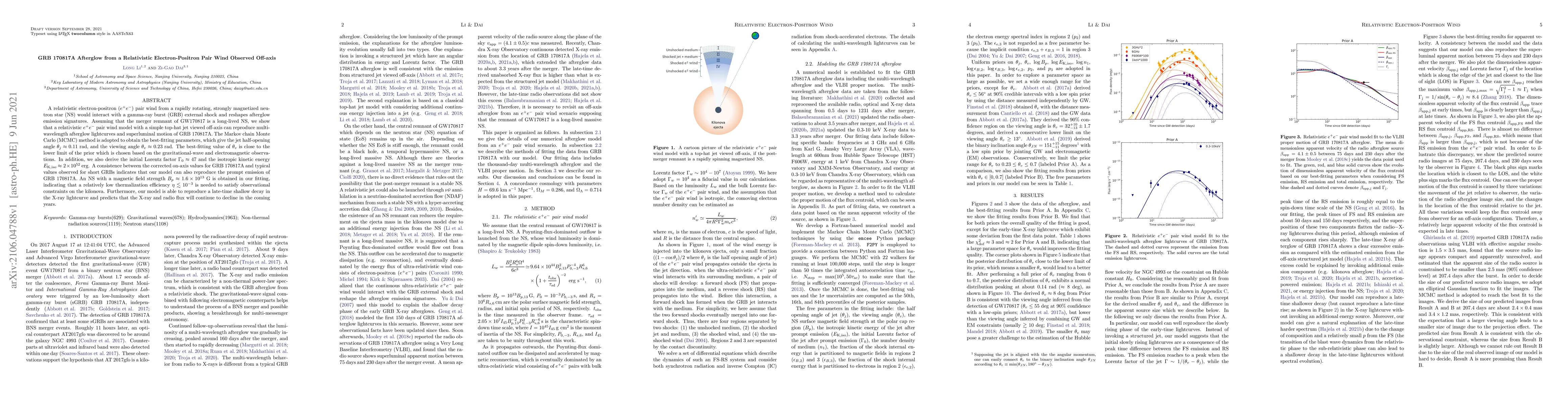 This paper proposes a relativistic electron-positron pair wind model to explain the off-axis afterglow emission of GRB 170817A, derived from the neutron star merger GW170817. The model fits multi-wavelength lightcurves and predicts a jet half-opening angle of approximately 0.11 rad, consistent with gravitational-wave and electromagnetic observations.