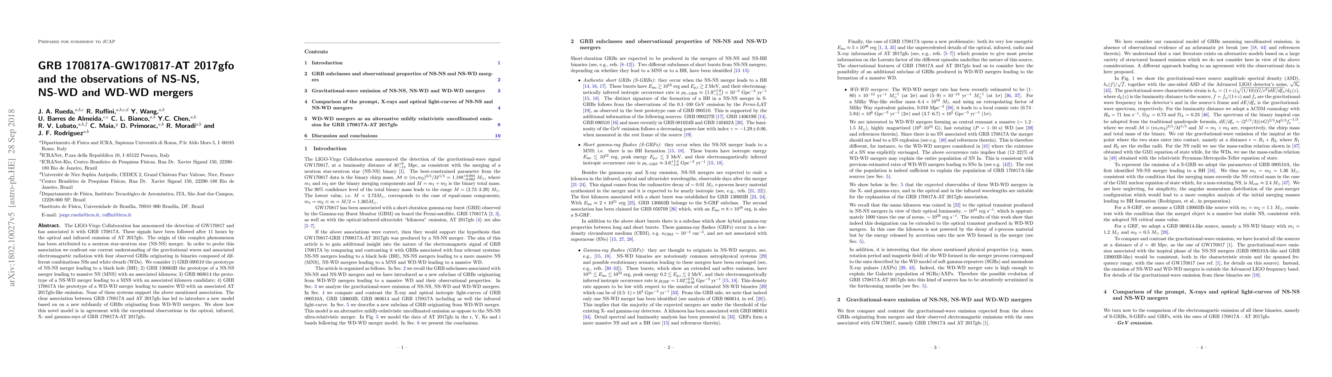 The LIGO-Virgo Collaboration has announced the detection of GW170817 and has associated it with GRB 170817A. These signals have been followed after 11 hours by the optical and infrared emission of AT 2017gfo. The origin of this complex phenomenon has been attributed to a neutron star-neutron star (NS-NS) merger. In order to probe this association we confront our current understanding of the gravitational waves and associated electromagnetic radiation with four observed GRBs originating in binaries composed of different combinations NSs and white dwarfs (WDs). We consider 1) GRB 090510 the prototype of NS-NS merger leading to a black hole (BH); 2) GRB 130603B the prototype of a NS-NS merger leading to massive NS (MNS) with an associated kilonova; 3) GRB 060614 the prototype of a NS-WD merger leading to a MNS with an associated kilonova candidate; 4) GRB 170817A the prototype of a WD-WD merger leading to massive WD with an associated AT 2017gfo-like emission. None of these systems support the above mentioned association. The clear association between GRB 170817A and AT 2017gfo has led to introduce a new model based on on a new subfamily of GRBs originating from WD-WD mergers. We show how this novel model is in agreement with the exceptional observations in the optical, infrared, X- and gamma-rays of GRB 170817A-AT 2017gfo.